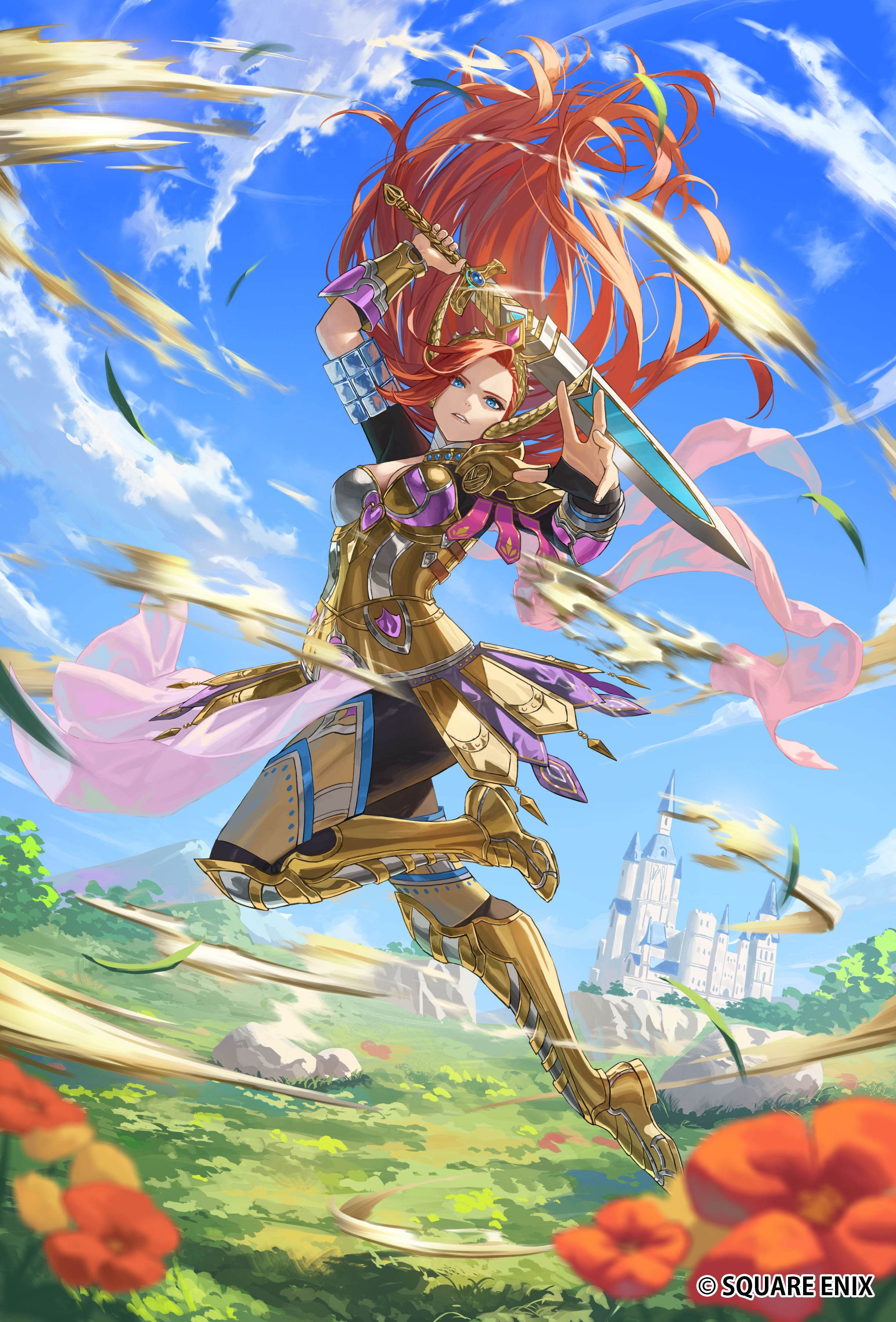 1girl absurdres armor castle cloud commentary_request flower full_body gold_armor grass hara_kenshi highres holding holding_sword holding_weapon long_hair looking_at_viewer official_art outdoors red_hair romancing_saga_re;universe saga solo square_enix sword weapon