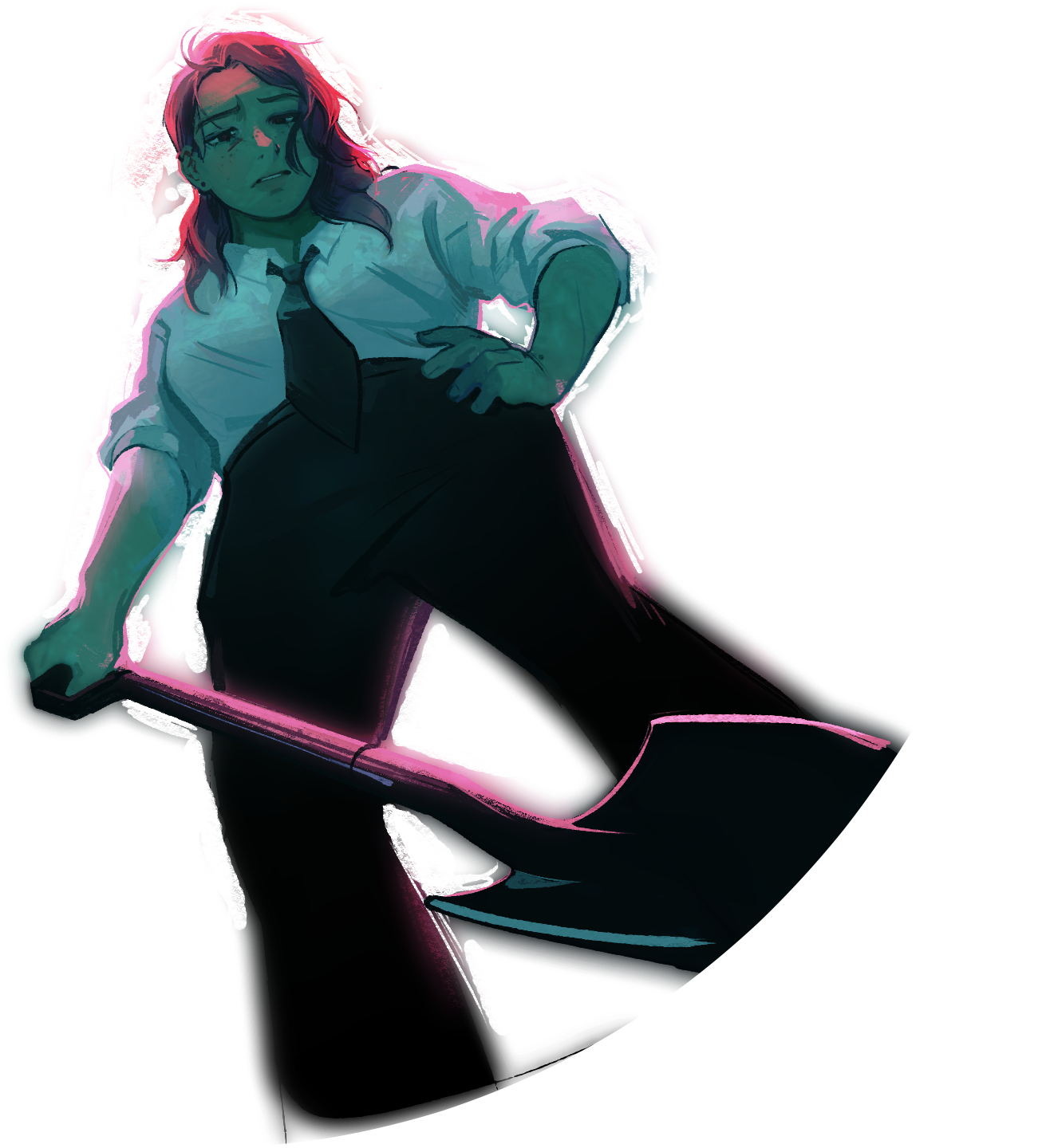 1girl angela_he black_eyes black_necktie collared_shirt colored_skin cowboy_shot from_below furrowed_brow green_skin hand_on_own_hip highres holding holding_shovel looking_at_viewer necktie non-web_source official_art parted_lips pink_hair planted planted_shovel shirt short_hair shovel sleeves_rolled_up solo stop_burying_me_alive_beautiful! transparent_background variant_set white_shirt