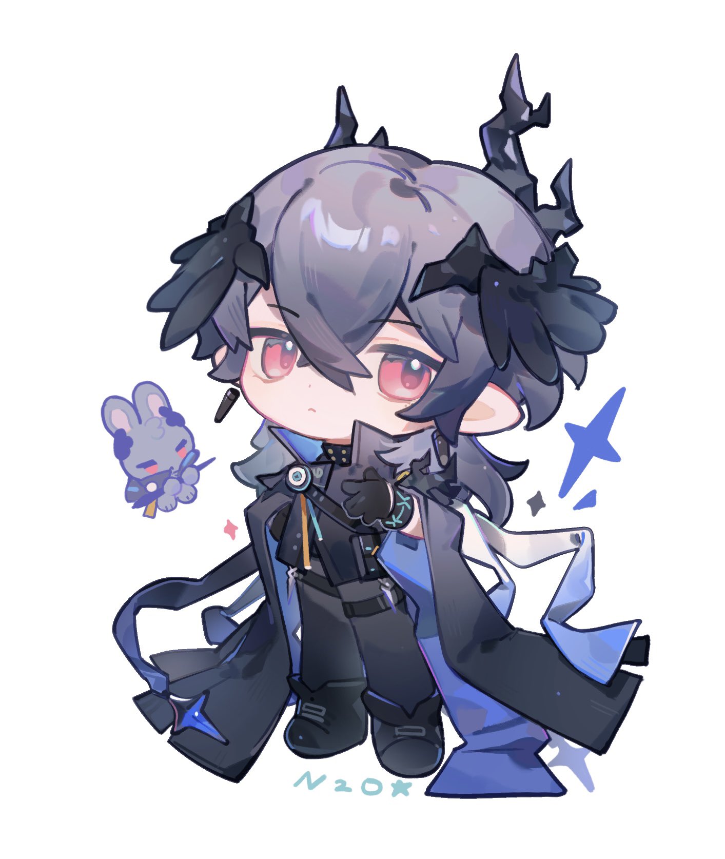 1boy arknights artist_name belt black_coat black_jacket black_pants chibi choshanland_plushy_(arknights) coat coat_on_shoulders commentary english_commentary frown grey_hair head_wings highres horns infection_monitor_(arknights) jacket logos_(arknights) looking_at_viewer male_focus nitrogen_owo pants pointy_ears red_eyes short_hair simple_background solo sparkle white_background wings