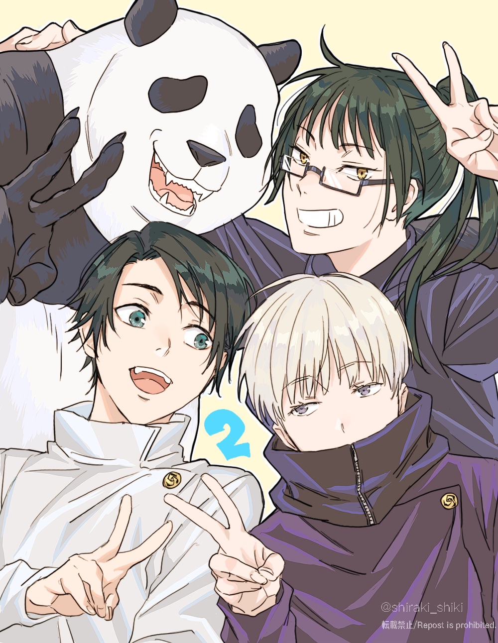 1girl 2boys :d animal arm_around_shoulder artist_name black_hair black_jacket blue_eyes brown_eyes commentary_request gakuran glasses grin hand_up high_collar high_ponytail highres inumaki_toge jacket jujutsu_kaisen long_sleeves looking_at_another looking_at_viewer multiple_boys okkotsu_yuta open_mouth panda panda_(jujutsu_kaisen) parted_bangs ponytail purple_eyes revision school_uniform shiraki_(shiraki_shiki) simple_background smile teeth upper_body upper_teeth_only v white_hair white_jacket yellow_background zen'in_maki