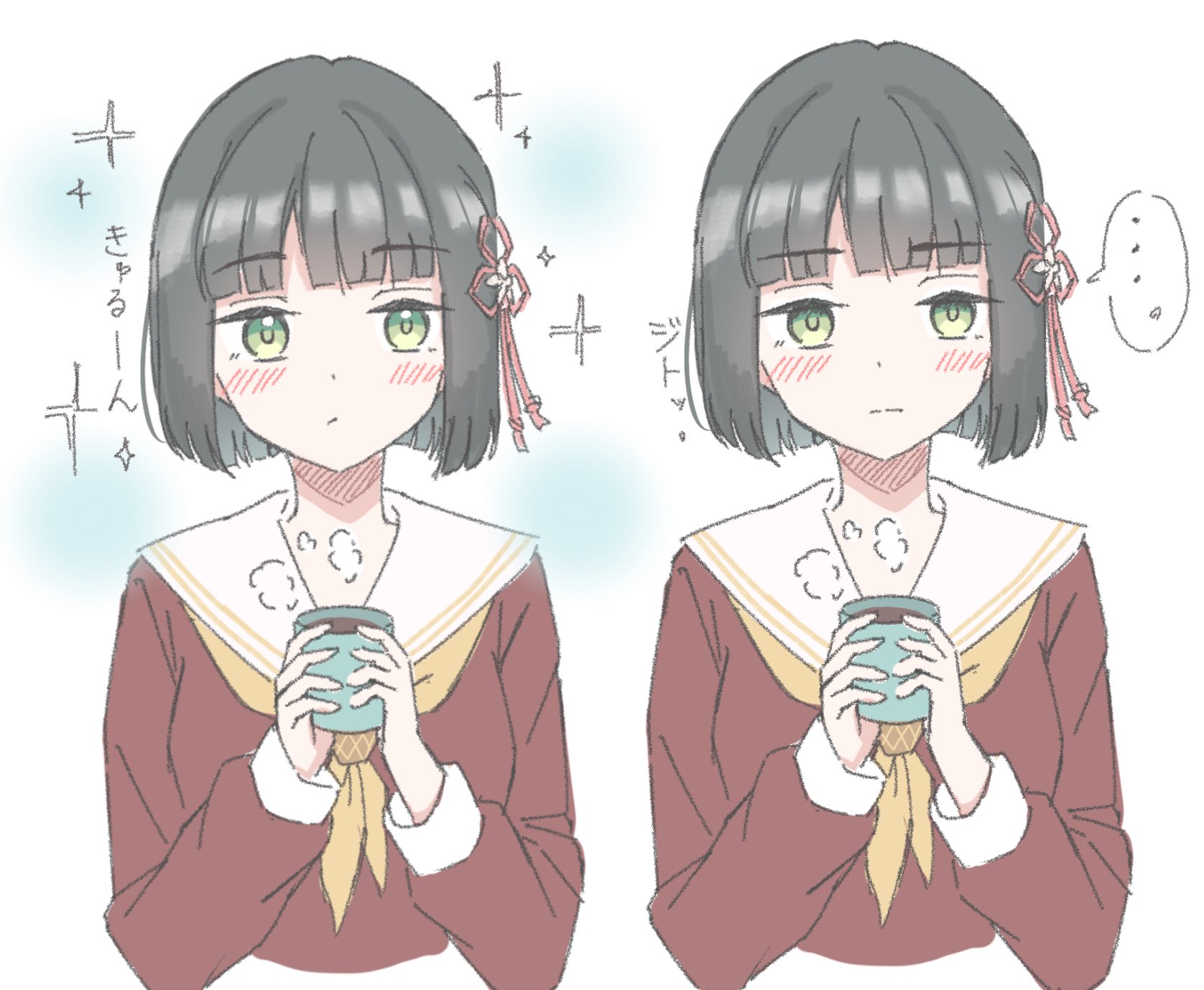 ... 1girl black_hair blue_background blunt_bangs blunt_ends blush bob_cut brown_dress closed_mouth coffee commentary_request cup dress expressionless flower flower_knot green_eyes hair_flower hair_ornament hasu_no_sora_school_uniform highres holding holding_cup iroha_(nami3) link!_like!_love_live! long_sleeves love_live! momose_ginko multiple_views neckerchief sailor_collar sailor_dress school_uniform short_hair sparkle spoken_ellipsis steam virtual_youtuber white_flower white_sailor_collar winter_uniform yellow_neckerchief