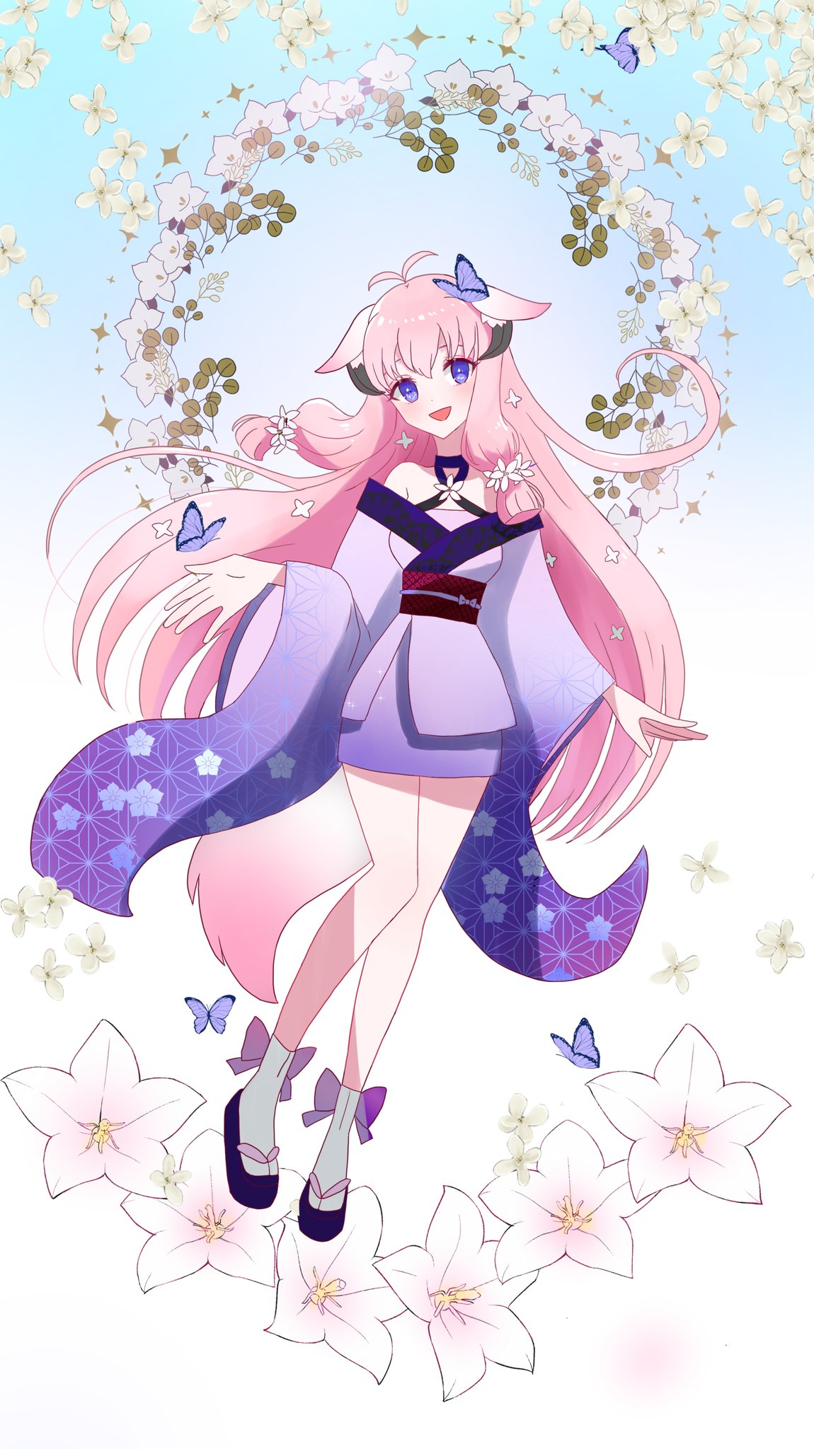 1girl animal_ears bug butterfly commentary_request fox_tail highres hina_(rune_factory) insect long_hair looking_at_viewer pink_hair purple_eyes rune_factory rune_factory:_guardians_of_azuma sandals smile solo tabi tail vmzdzxnx7fiyoxx