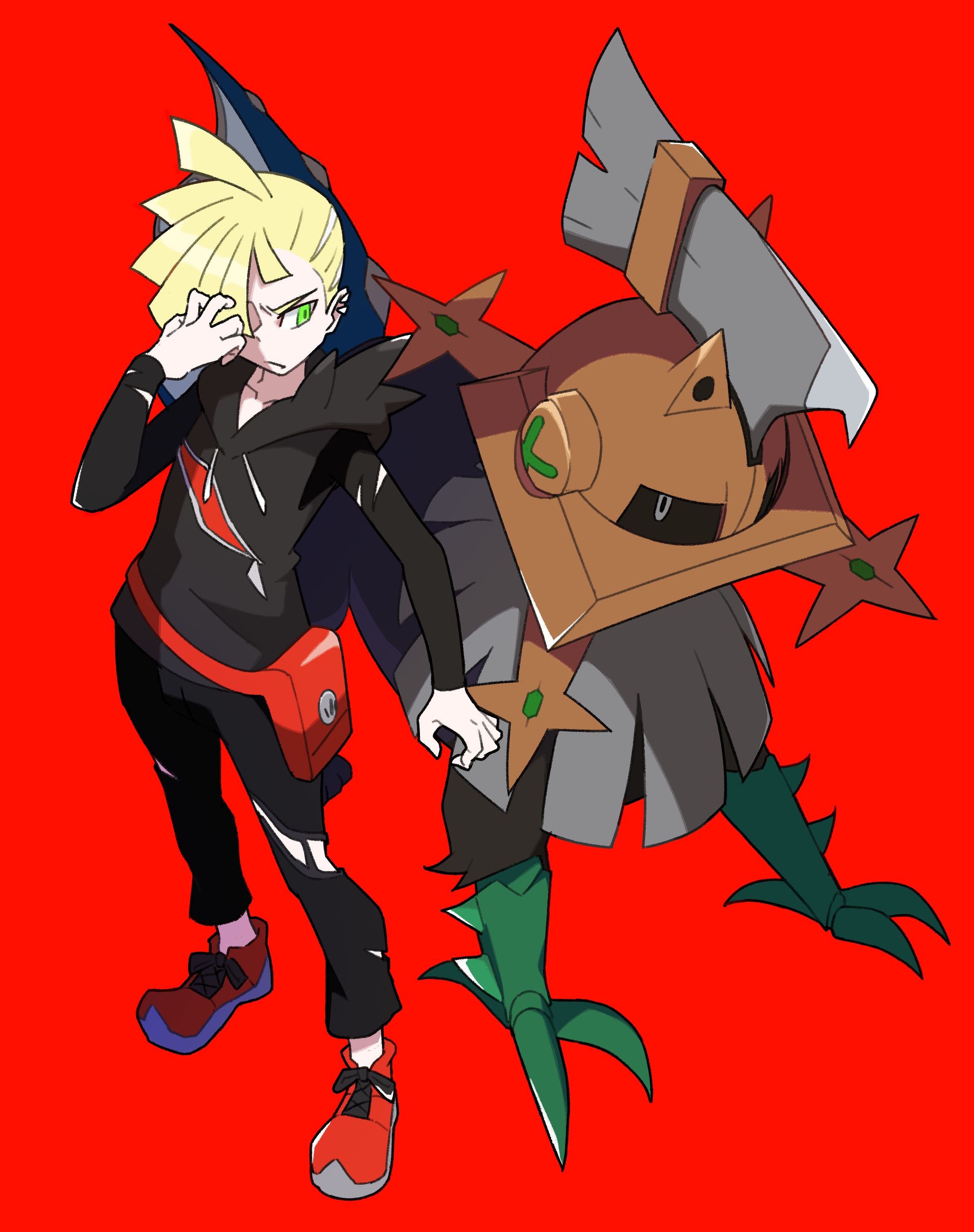 1boy absurdres black_hoodie black_pants blonde_hair closed_mouth commentary_request ear_piercing gen_7_pokemon gladion_(pokemon) green_eyes grey_eyes hair_over_one_eye helmet highres hood hood_down hoodie legendary_pokemon long_sleeves male_focus mup0106 nintendo pants piercing pokemon pokemon_(creature) pokemon_sm red_background red_bag red_shoes shoelaces shoes short_hair simple_background standing type:_null