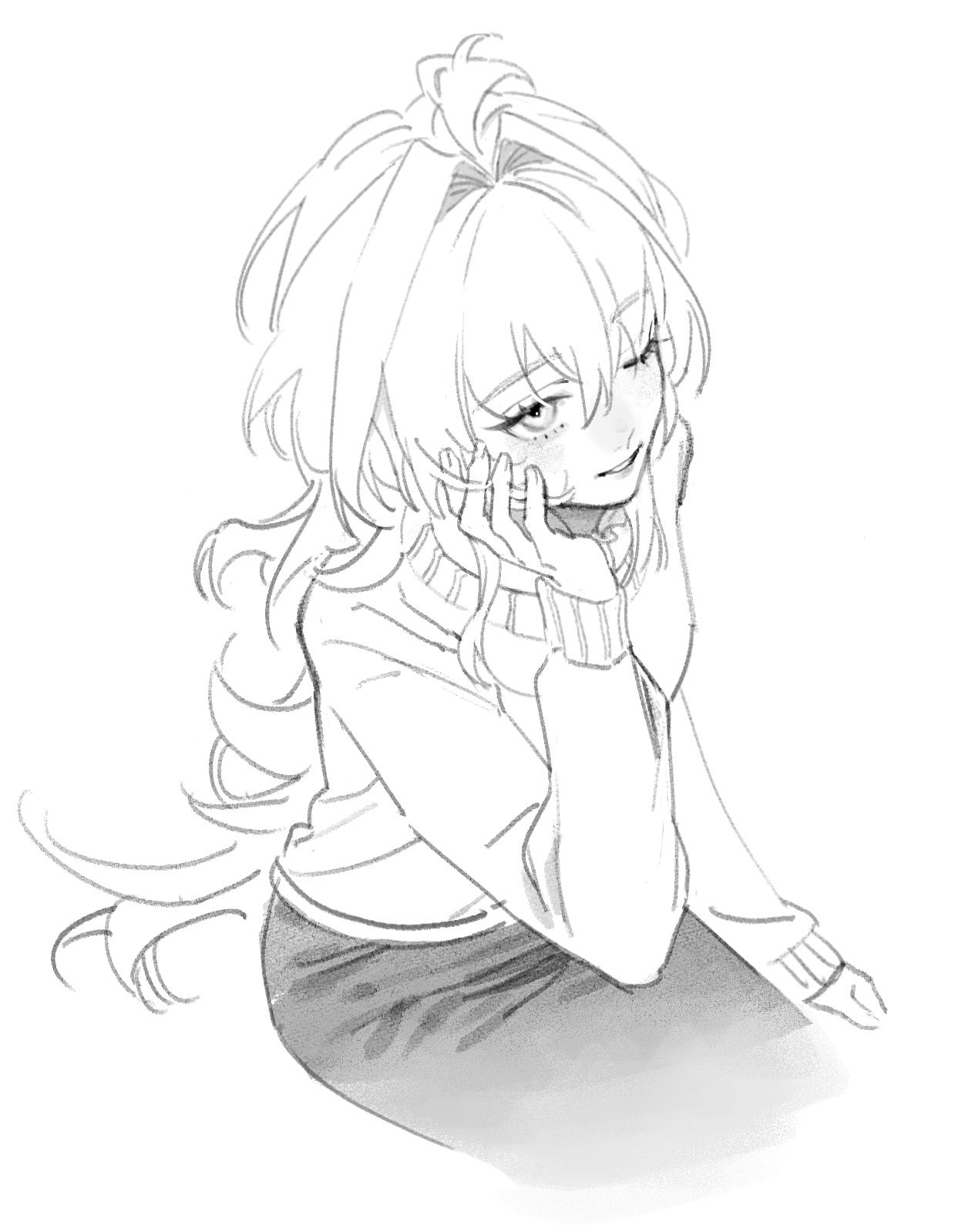 1girl ahoge commentary commentary_request cowboy_shot fate/grand_order fate_(series) greyscale hand_on_own_cheek hand_on_own_face highres long_hair long_sleeves looking_at_viewer merlin_(fate/prototype) monochrome one_eye_closed simple_background sitting someki_noi