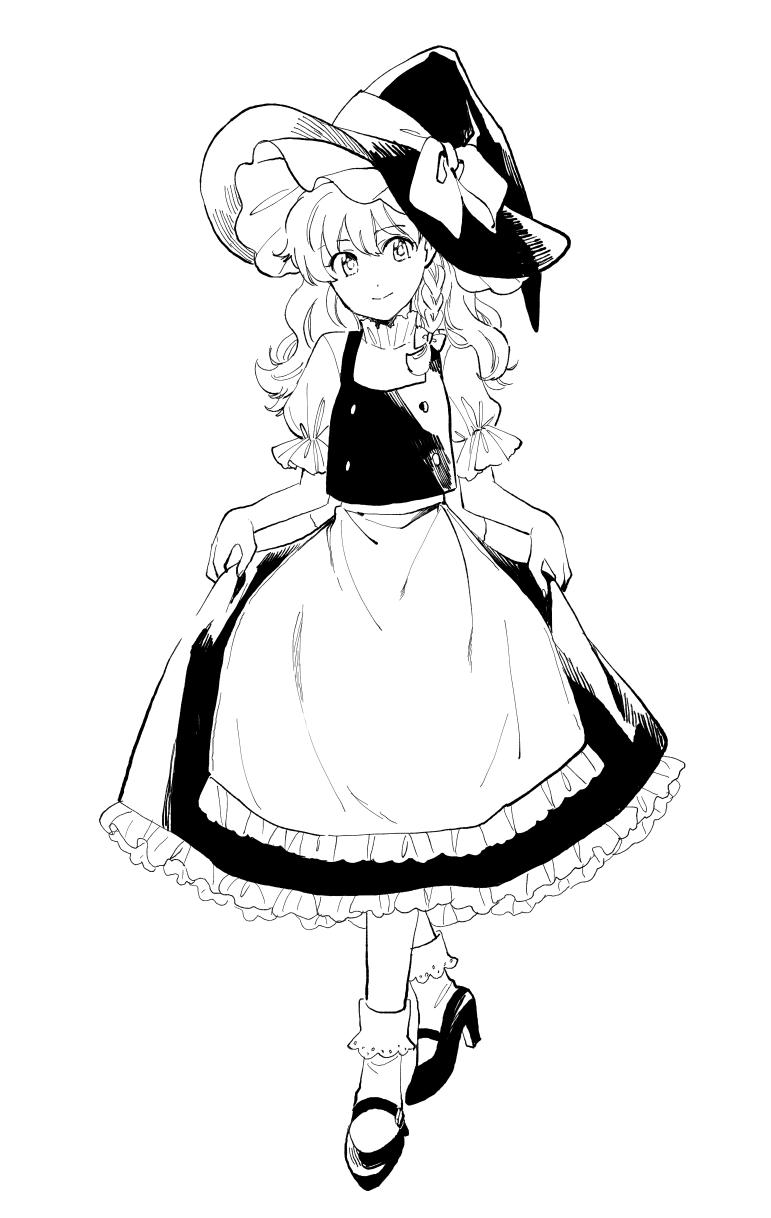 1girl apron bow braid buttons commentary_request frilled_apron frilled_socks frills full_body greyscale hair_bow high_heels highres holding_own_skirt kirisame_marisa long_hair monochrome natsume_(menthol) shirt shoes single_braid skirt socks solo touhou vest white_background