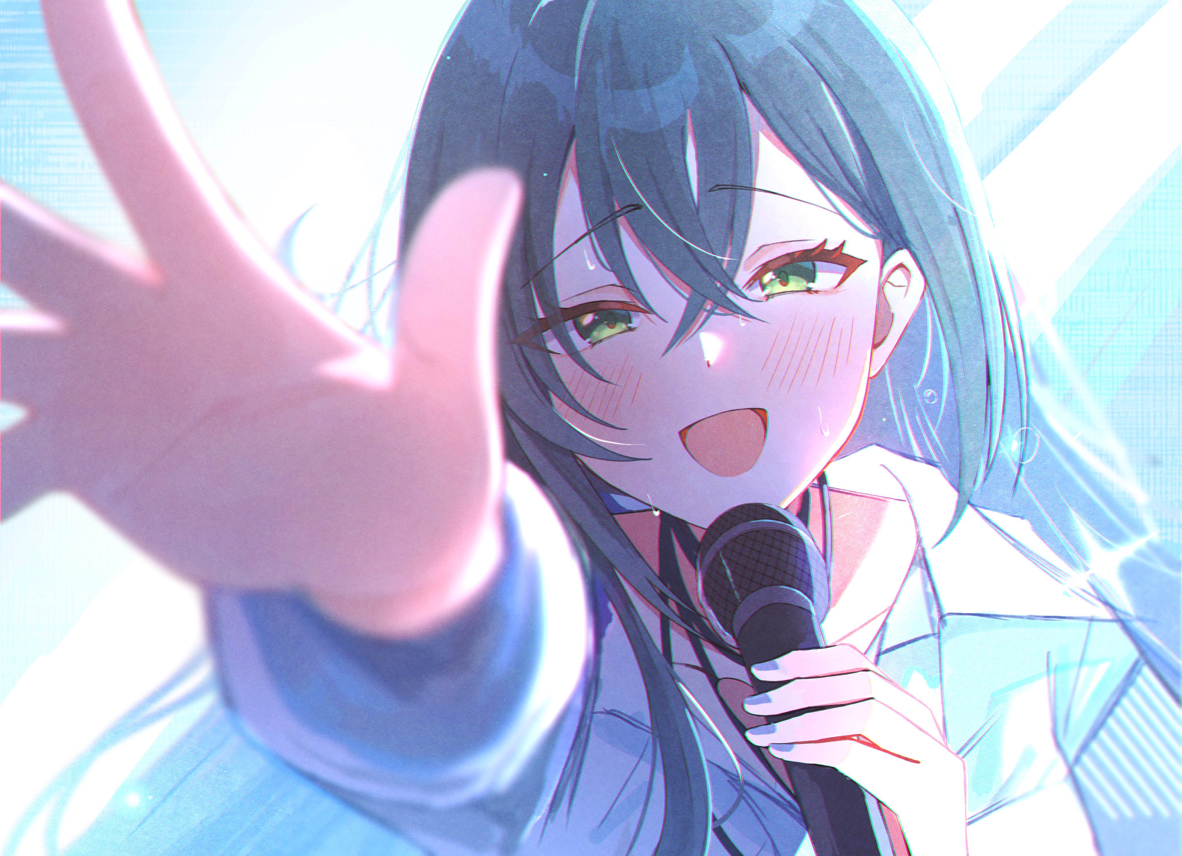 1girl absurdres blue_nails blurry blurry_foreground blush commentary_request crossed_bangs depth_of_field fingernails gakuen_idolmaster green_eyes green_hair hair_between_eyes highres holding holding_microphone idolmaster iroha_822 jacket long_hair long_sleeves looking_at_viewer microphone nail_polish open_mouth outstretched_arm reaching reaching_towards_viewer sidelighting solo sweat tsukimura_temari upper_body