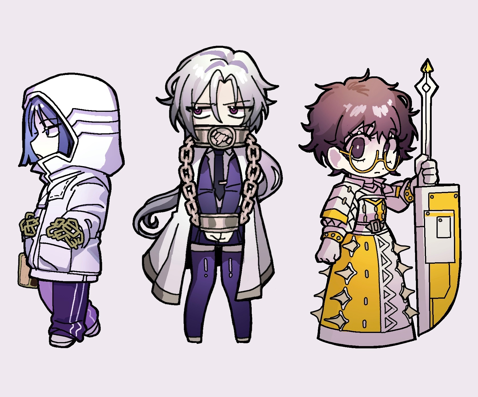 1girl 2boys albina_(project_moon) albina_(project_moon)_(cosplay) armor armored_dress black_eyes black_hair blue_eyes blue_hair cape commentary cosplay crossdressing crossdressing_(mtf) dress english_commentary full_body glasses gloves gold_trim grey_hair hands_in_pockets highres holding holding_sword holding_weapon jacket kira_(project_moon) kira_(project_moon)_(cosplay) limbus_company long_hair looking_to_the_side low_ponytail lucio_(project_moon) multiple_boys open_mouth pants pink_eyes ponytail project_moon purple_pants ren_(project_moon) simple_background sora_(project_moon) sora_(project_moon)_(cosplay) spiked_dress sword twobillionwasps very_long_hair weapon white_background white_cape white_gloves white_jacket