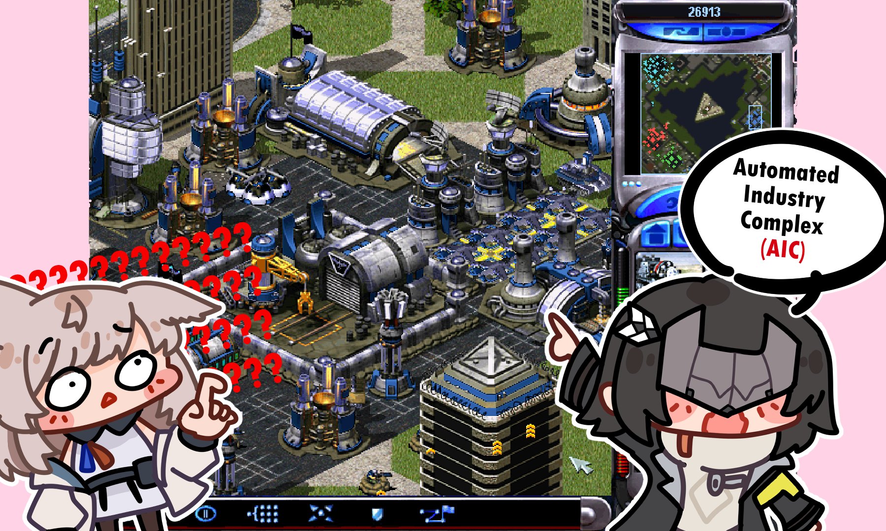 2girls ? ?? animal_ears arknights arknights:_endfield bird_ears bird_girl black_hair black_jacket blush chibi chibi_only command_&_conquer command_&_conquer:_red_alert command_&_conquer:_red_alert_2 commentary dress endministrator_(arknights) english_commentary english_text eye_mask female_endministrator_(arknights) ffrouty_aiz hair_ornament hand_up highres jacket mask multiple_girls off_shoulder open_clothes open_jacket open_mouth perlica_(arknights) pointing screenshot_inset white_dress white_jacket