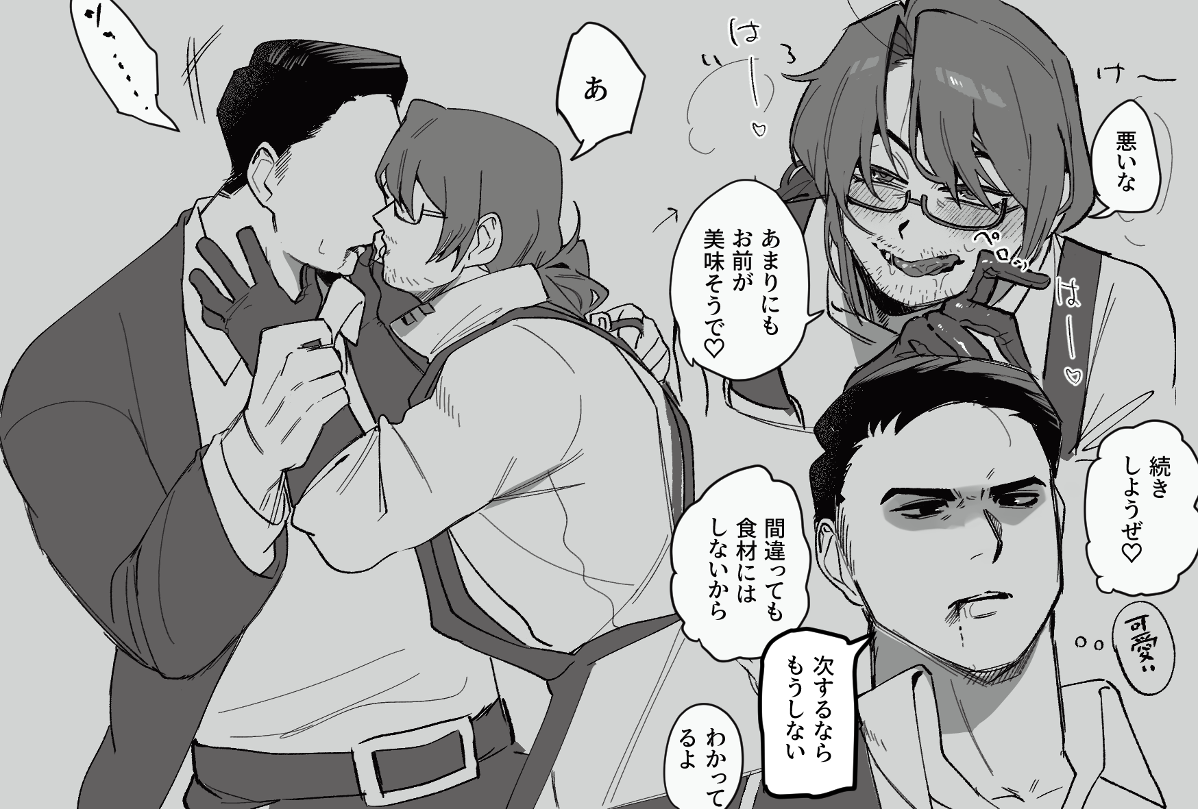 2boys 3koma absurdres angry apron beard_stubble belt black_suit blood blood_from_mouth blood_on_face blush breath bruise buckle collared_shirt comic dress_shirt drooling eye_contact faceless faceless_male facial_hair finger_to_cheek formal_clothes french_kiss glaring glasses gloves gregor_(project_moon) greyscale hair_between_eyes half-closed_eyes hand_on_another's_back hand_on_another's_face hand_up hands_on_another's_face heart highres holding_another's_wrist injury jacket kiss licking licking_lips limbus_company long_hair long_sleeves looking_at_another looking_down looking_up low_ponytail male_focus meursault_(project_moon) monochrome multiple_boys multiple_views muscular muscular_male necktie okazu1324343 open_clothes open_jacket open_mouth pants parted_bangs parted_lips ponytail project_moon r.b._(identity)_(project_moon) saliva saliva_trail sanpaku semi-rimless_eyewear shaded_face shirt short_hair simple_background smile smirk smug speech_bubble standing stubble suit sweatdrop teeth thought_bubble tongue tongue_out translation_request turtleneck turtleneck_shirt under-rim_eyewear upper_body yaoi