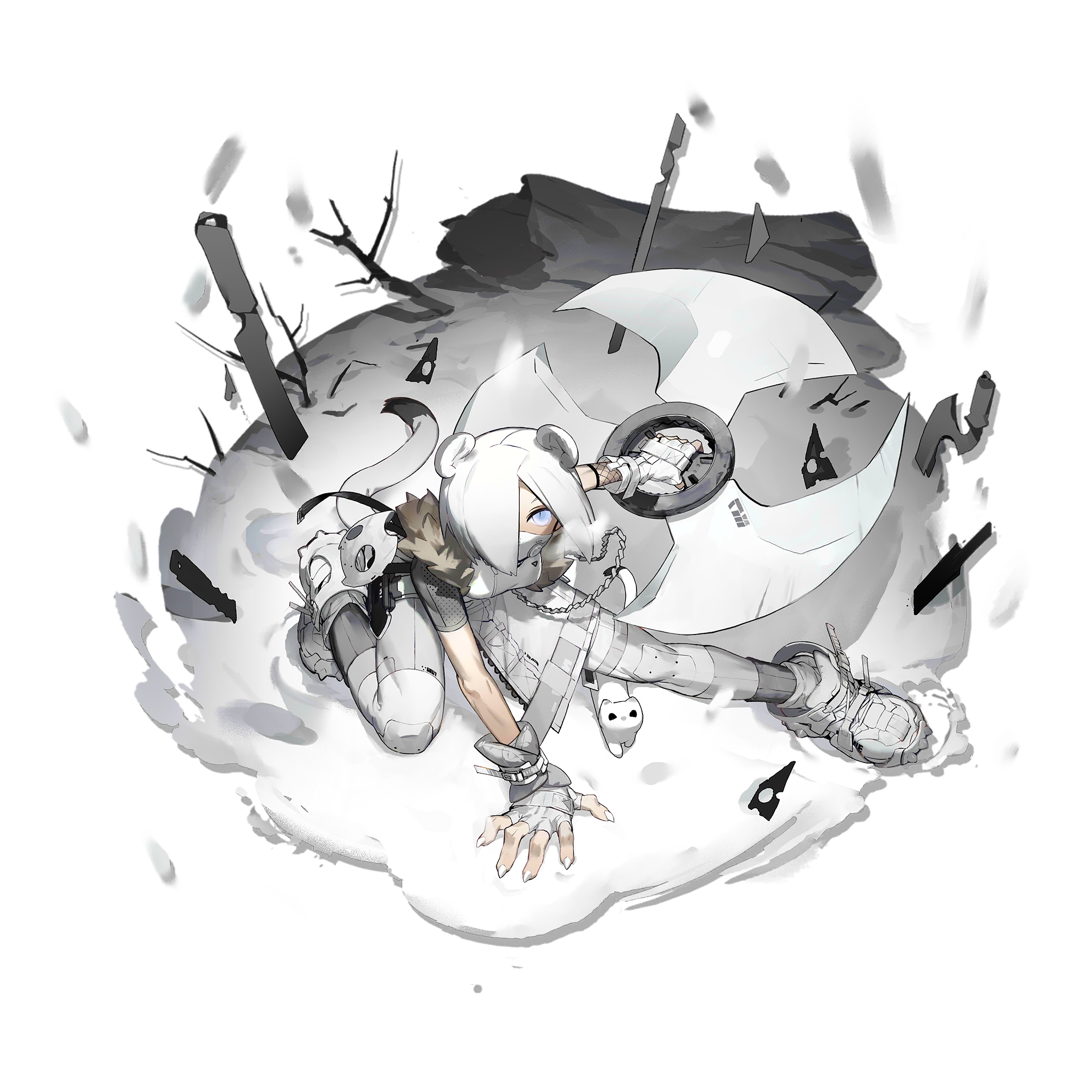 1girl a_gui animal animal_ears arknights arm_support blue_eyes fingerless_gloves fingernails from_above full_body fur_trim gloves hair_over_one_eye highres holding holding_weapon looking_at_viewer mask mouth_mask ninja ninja_mask official_alternate_costume official_art pants planted shirayuki_(arknights) shirayuki_(wind_of_breaking_blade)_(arknights) shirt shoes short_hair short_sleeves shuriken simple_background slit_pupils sneakers snow solo tail weapon weasel_ears weasel_girl weasel_tail white_background white_gloves white_hair white_pants white_shoes white_theme