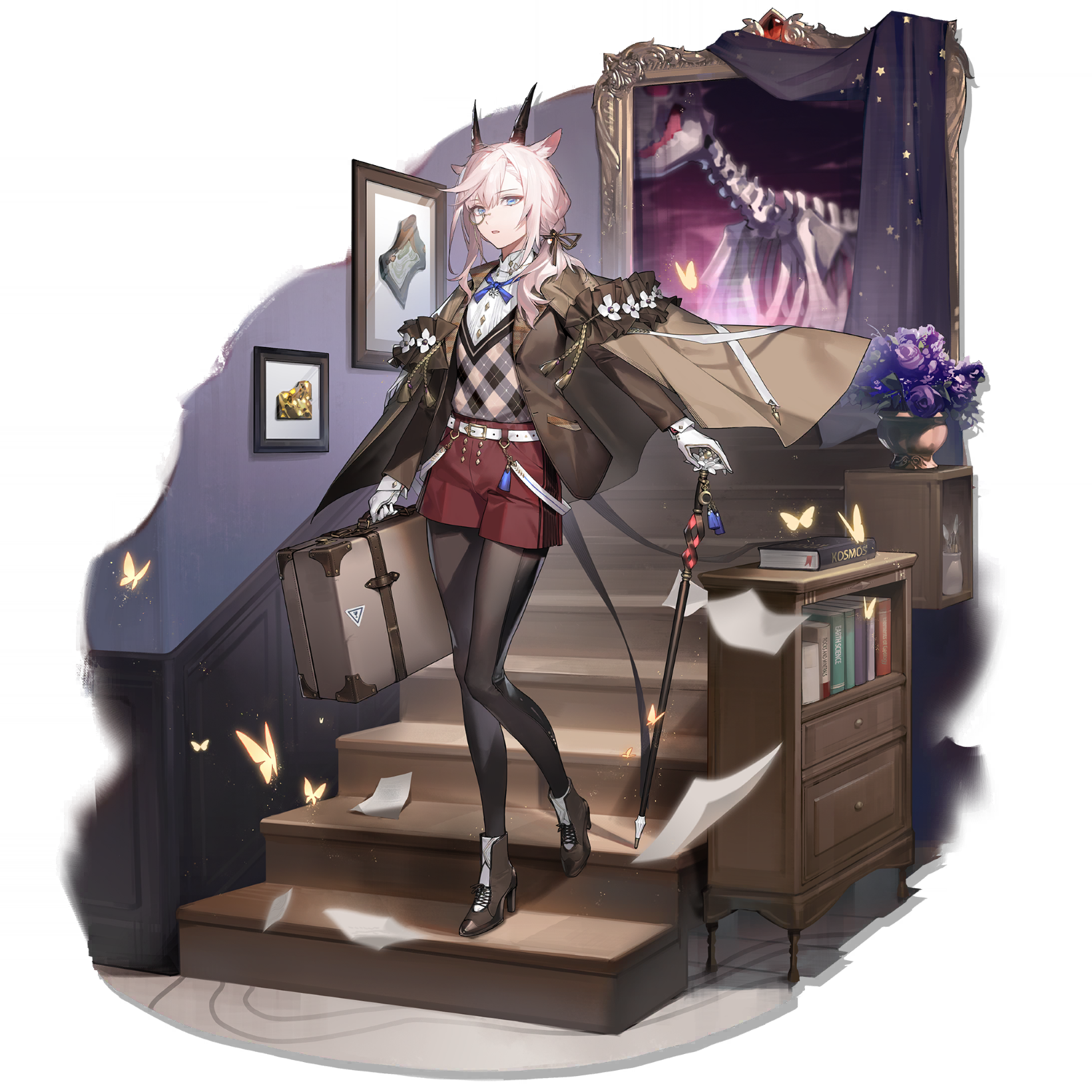 1girl animal_ears ankle_boots arknights belt black_pantyhose black_ribbon blue_eyes bolo_tie book boots briefcase brown_boots brown_coat brown_jacket bug butterfly cane closed_mouth coat coat_on_shoulders collared_shirt drawer drawing_(object) earthspirit_(arknights) earthspirit_(major_field)_(arknights) flower flying_paper full_body gloves goat_ears goat_girl goat_horns hair_between_eyes high_heels highres holding holding_cane holding_suitcase horns hug_(yourhug) indoors insect jacket jacket_on_shoulders long_hair long_sleeves looking_at_viewer low_ponytail neck_ribbon official_alternate_costume official_art open_clothes open_jacket painting_(object) pantyhose pantyhose_under_shorts paper photo_(object) picture_frame pink_hair plant ponytail portrait_(object) potted_plant purple_flower purple_rose red_shorts ribbon rose shirt shoes shorts solo stairs standing suitcase transparent_background vase vest white_belt white_gloves white_shirt yellow_butterfly