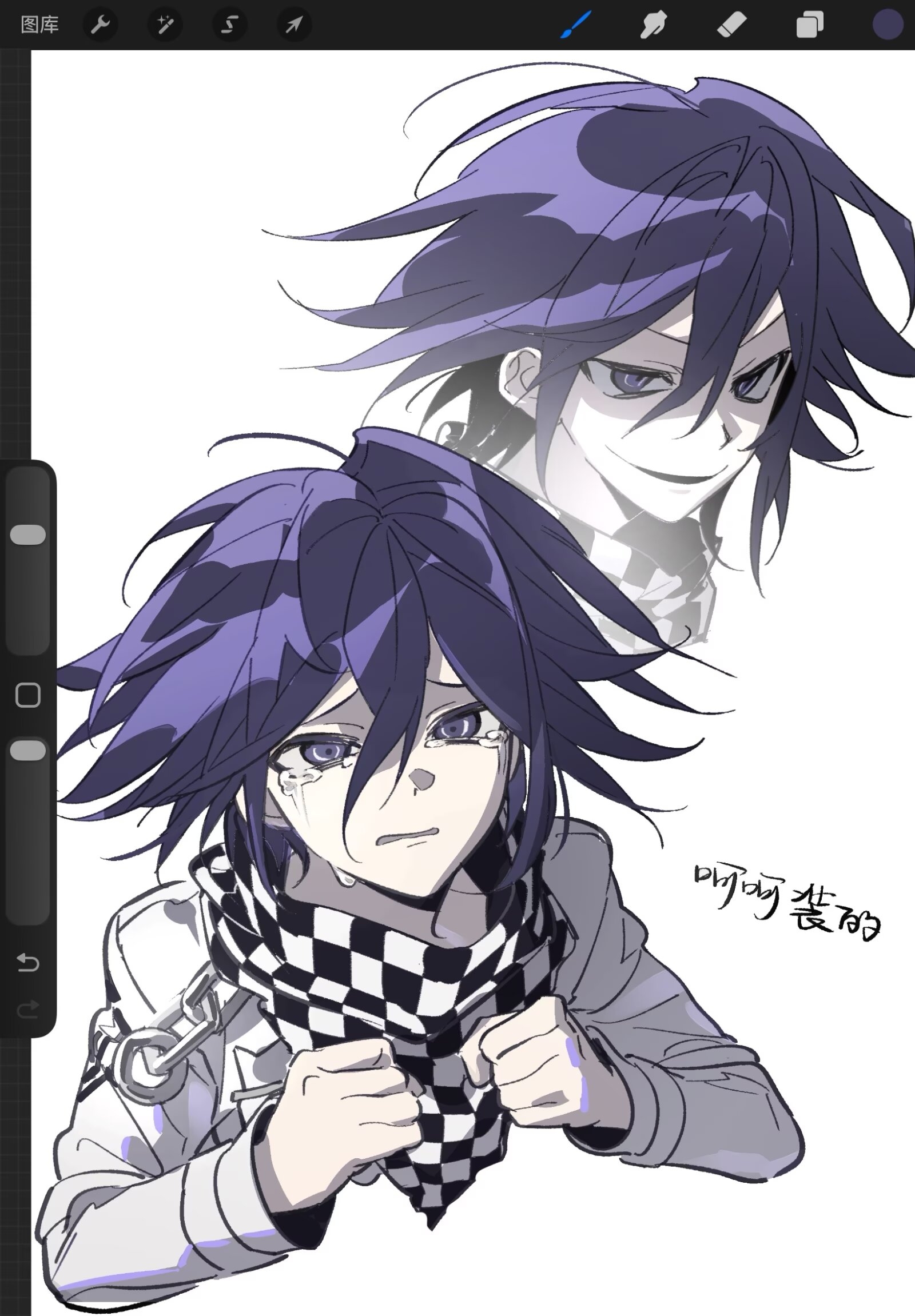 1boy :d ahoge androgynous art_program_in_frame black_scarf chain checkered_clothes checkered_scarf clenched_hands commentary crescent_mouth cropped_head cropped_torso crying crying_with_eyes_open danganronpa_(series) danganronpa_v3:_killing_harmony double-parted_bangs flipped_hair from_above hair_between_eyes hair_intakes highres jacket long_hair_between_eyes long_sleeves looking_at_viewer male_focus oma_kokichi open_mouth pale_skin procreate_(software) purple_eyes purple_hair raised_inner_eyebrows scarf shaded_face short_hair simple_background smile untranslatable_commentary tears translation_request two-tone_scarf v-shaped_eyebrows white_background white_jacket white_scarf zayaaa_zaya