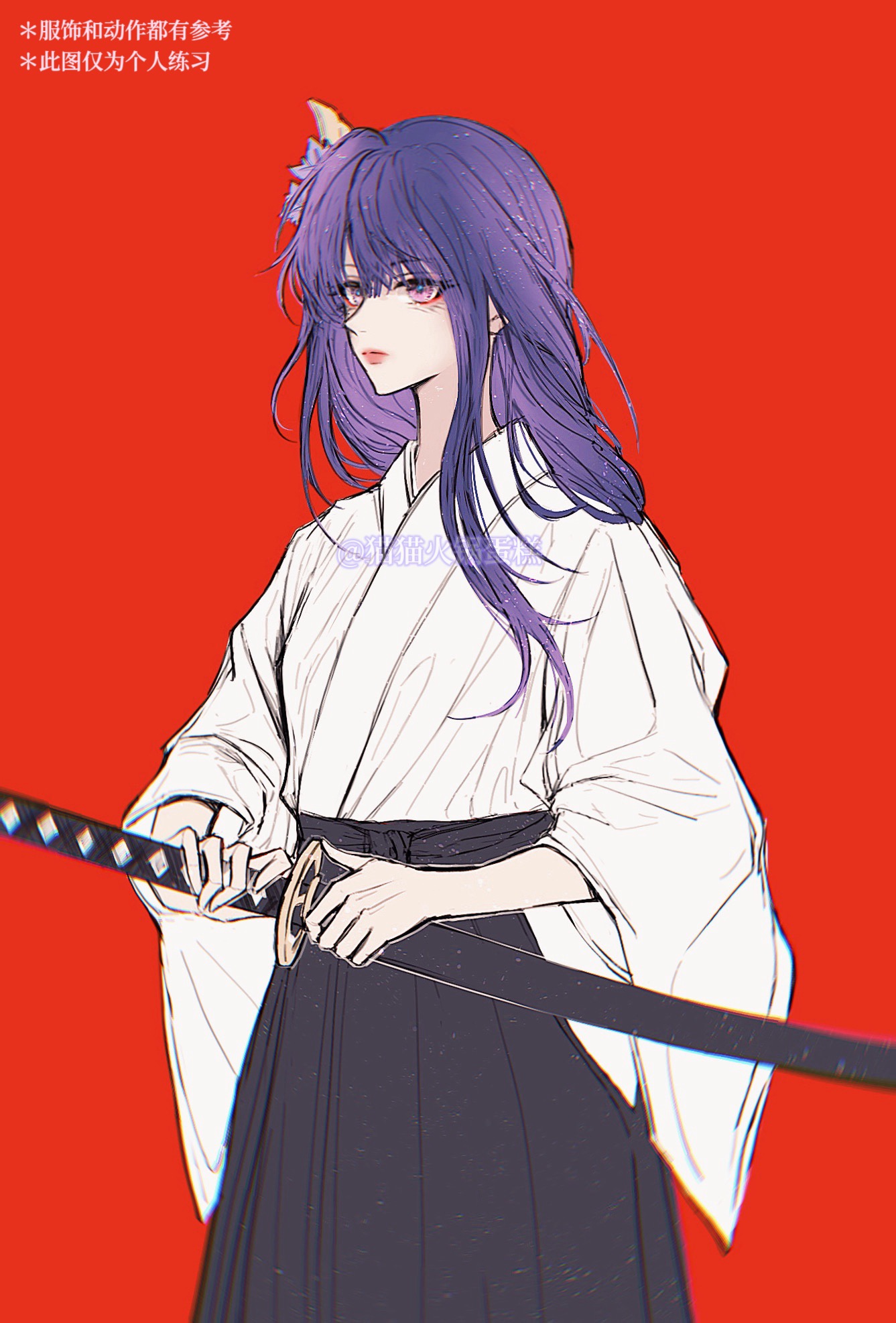 1girl alternate_costume bad_id bad_lofter_id blue_pupils blunt_bangs genshin_impact hair_ornament highres holding holding_sword holding_weapon japanese_clothes katana long_hair long_sleeves meowhpcake multicolored_eyes purple_eyes purple_hair raiden_shogun red_background simple_background solo standing sword upper_body weapon wide_sleeves