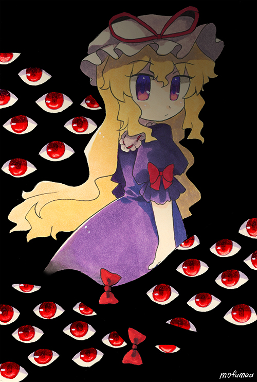 1girl artist_name blonde_hair bow closed_mouth commentary_request dress gap_(touhou) hat hat_ribbon long_hair looking_at_viewer mob_cap mofumaa puffy_short_sleeves puffy_sleeves purple_dress red_bow red_ribbon ribbon short_sleeves sleeve_bow touhou traditional_media very_long_hair white_hat yakumo_yukari