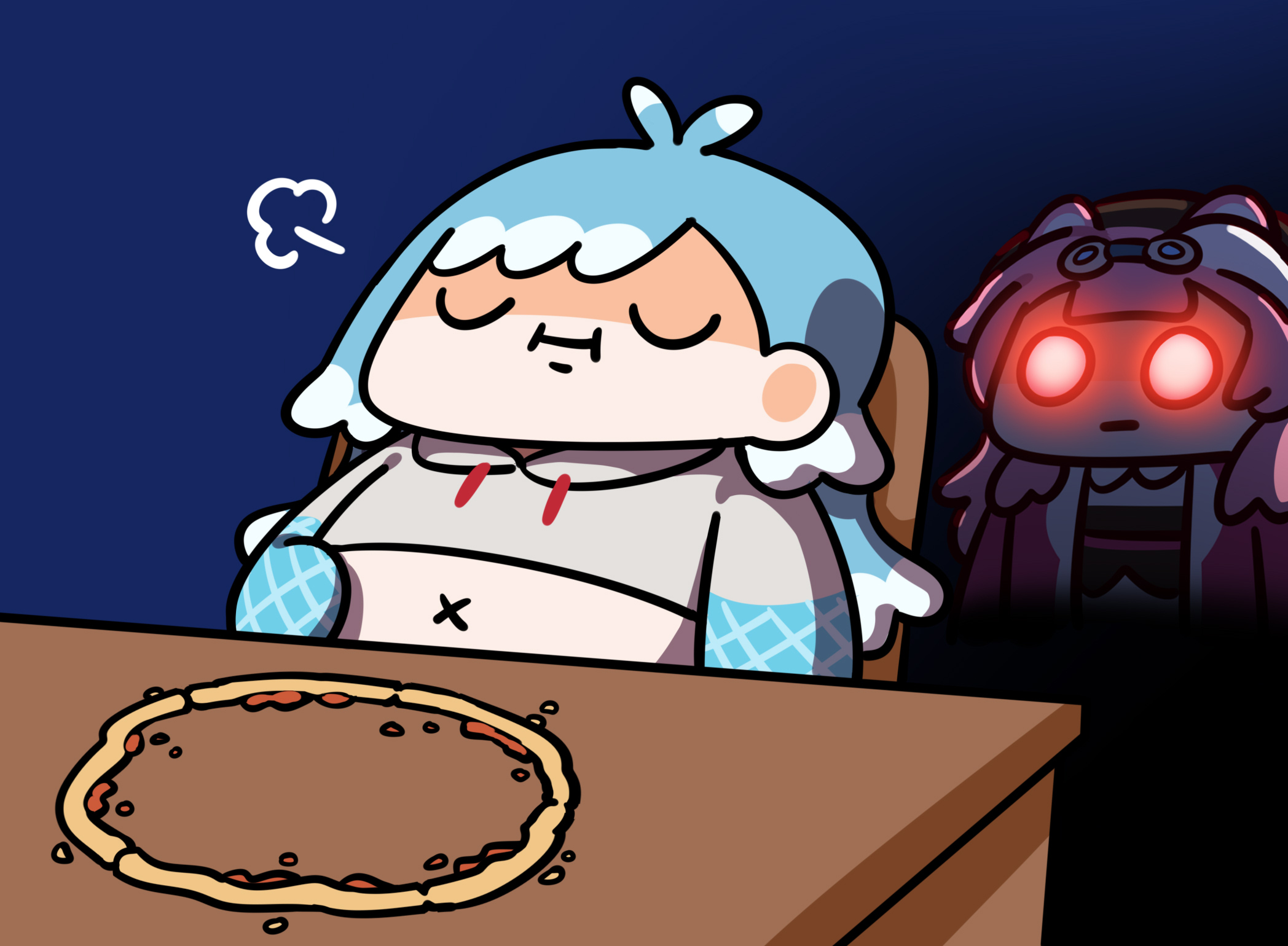 2girls animal_ears antenna_hair beret blue_hair closed_mouth commentary crimes_against_food fat fat_woman food glowing glowing_eyes goggles hashtag-only_commentary hat highres hololive hololive_english hololive_indonesia keenbiscuit kobo_kanaeru kobo_kanaeru_(1st_costume) long_hair multicolored_hair multiple_girls navel panther_ears panther_girl pink_hair pizza pizza_crust raora_panthera raora_panthera_(1st_costume) red_eyes streaked_hair virtual_youtuber