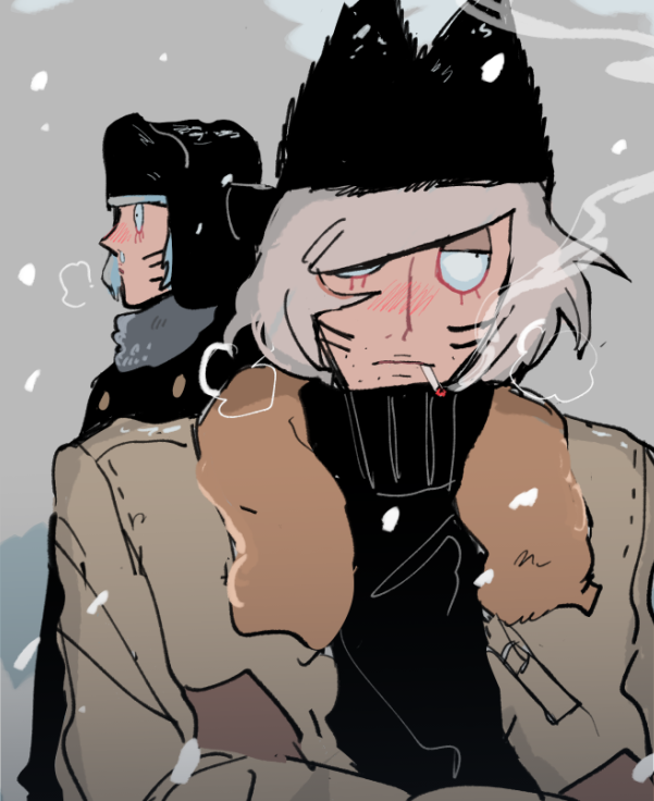 2boys alternate_costume animal_ear_headwear cigarette coat drawn_whiskers facial_hair fake_animal_ears half-closed_eyes hat looking_to_the_side multiple_boys muted_color nyen_(randal's_friends) nyon_(randal's_friends) randal's_friends scarlet_ninjya smoking snowing stubble turtleneck upper_body ushanka white_hair winter_clothes winter_coat