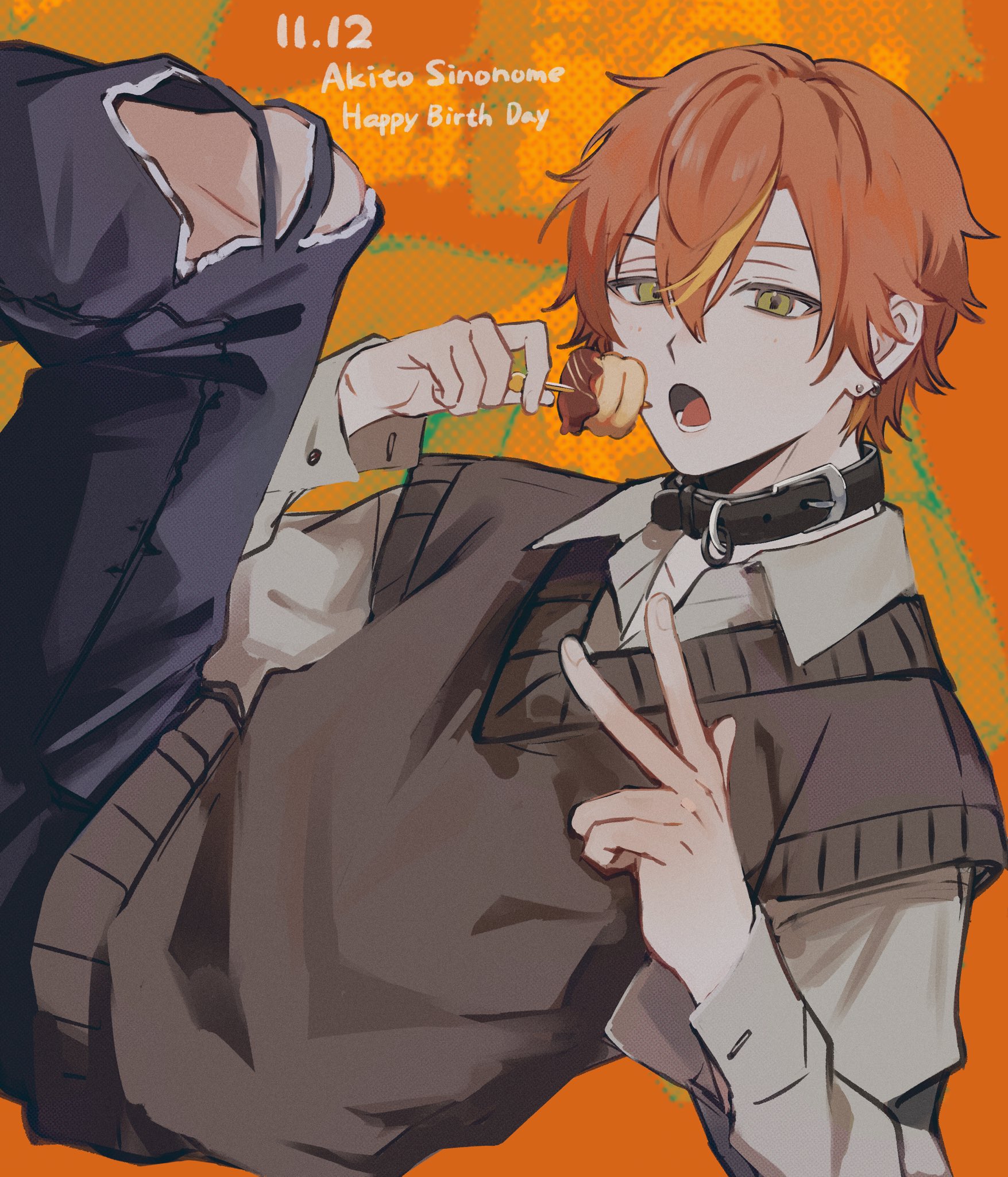 1boy belt belt_buckle belt_collar black_belt buckle character_name collar collared_shirt commentary_request dated double-parted_bangs earrings fingernails food green_eyes hair_between_eyes happy_birthday highres holding jewelry layered_clothes long_sleeves looking_at_viewer lower_teeth_only male_focus multicolored_hair open_mouth orange_background orange_hair pants project_sekai shinonome_akito shirt short_hair sorase_(so17p) streaked_hair stud_earrings sweater_vest teeth torn_clothes torn_pants two-tone_hair v-neck