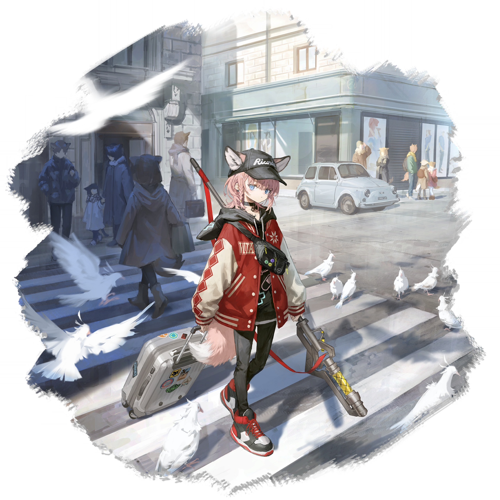 6+boys 6+girls animal_ears arknights bag baseball_cap bird black_choker black_hat black_jacket black_pants black_pantyhose black_shoes black_shorts blue_eyes bow_(weapon) braid building car choker closed_mouth crossbow crosswalk day dove ears_through_headwear fox_ears fox_girl fox_tail full_body hat highres holding holding_bag holding_suitcase holding_weapon hood hood_down hooded_jacket infection_monitor_(arknights) jacket long_sleeves looking_at_viewer material_growth motor_vehicle multicolored_jacket multiple_boys multiple_girls official_alternate_costume official_art open_clothes open_jacket oripathy_lesion_(arknights) outdoors pants pantyhose people pigeon pink_hair puffy_long_sleeves puffy_sleeves red_jacket road shoes short_hair shorts sneakers solo_focus standing street suitcase sussurro_(arknights) sussurro_(travel_freely)_(arknights) tail todoroki_masaru transparent_background walking weapon