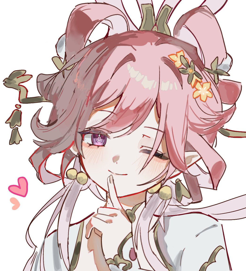 1girl ;) chinese_hairstyle diamond-shaped_pupils diamond_(shape) earrings elf elysia_(hi_love_elf)_(honkai_impact) elysia_(honkai_impact) elysia_(lunar_grace)_(honkai_impact) feixianji_(hairstyle) flower hair_flower hair_ornament hair_rings hashtag-only_commentary heart honkai_(series) honkai_impact_3rd jewelry ko_(assd_009) long_hair looking_at_viewer official_alternate_costume one_eye_closed pink_hair pointy_ears purple_eyes simple_background smile solo symbol-shaped_pupils very_long_hair white_background