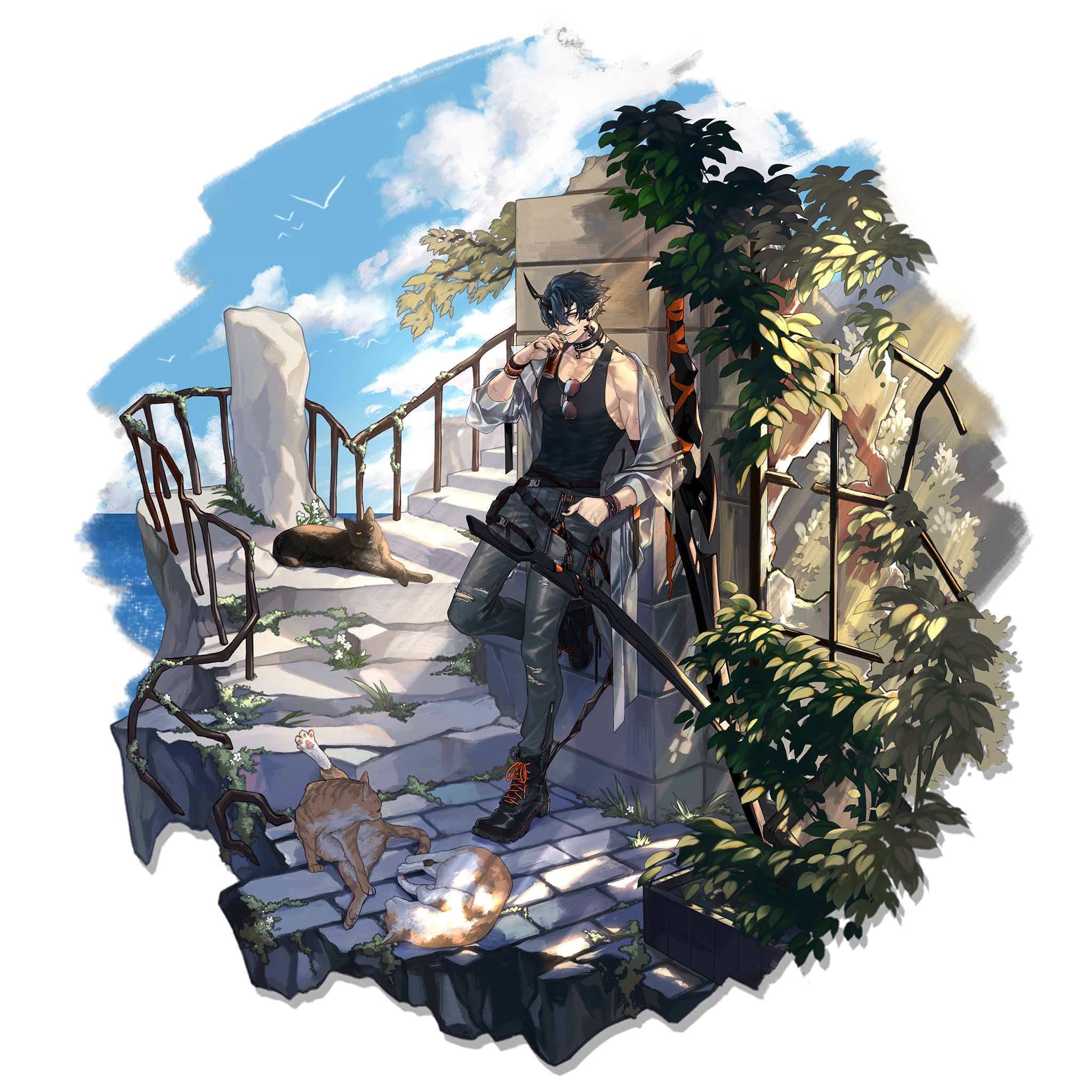 abs animal arknights asymmetrical_clothes bare_shoulders belt bird black_boots black_cat black_pants black_tank_top blue_sky blurry boots bracelet cargo_pants cat choker cloud cloudy_sky day depth_of_field dynamic_pose fingerless_gloves flamebringer_(arknights) flamebringer_(casual_vacation)_(arknights) flower foliage gloves grass hand_on_own_hip hand_to_own_mouth highres horizon ivy jacket jewelry long_sleeves looking_at_viewer lying midriff multiple_bracelets multiple_cats multiple_tails muscular muscular_male no_sense_of_shame ocean official_art open_clothes open_shirt orange_belt orange_cat orange_gloves outdoors overgrown pants paw_print perspective plant railing ruins scabbard seagull sheath sitting sky sleeping sleeveless smirk spiked_choker spikes stairs sunlight sword tail tank_top toned torn_clothes vines weapon white_jacket