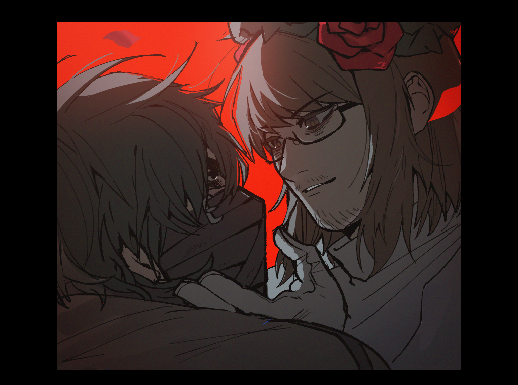 2boys absurdres alternate_costume bags_under_eyes beard_stubble belt black-framed_eyewear black-framed_glasses black_border black_eyes black_hair border brown_eyes brown_hair capelet close-up covered_mouth crown_of_thorns dress e.g.o_(project_moon) eye_contact face-to-face facial_hair facing_another flower flower_wreath formal_clothes from_side garden_of_thorns_(e.g.o) glasses gloves grabbing_another's_chin gregor_(project_moon) hair_between_eyes hair_flower hair_ornament hair_vines hairband half-closed_eyes hand_on_another's_chin hand_on_another's_face hand_up head_wreath highres limbus_company long_hair long_sleeves looking_at_another looking_down looking_up male_bride male_focus mask messy_hair meursault_(project_moon) mouth_mask multiple_boys official_alternate_costume okazu1324343 parted_bangs parted_lips petals plant portrait profile project_moon red_background red_flower red_rose regret_(e.g.o) rose rose_petals semi-rimless_eyewear short_hair sidelocks simple_background straitjacket stubble thorns under-rim_eyewear upper_body vines white_capelet white_dress white_gloves yaoi