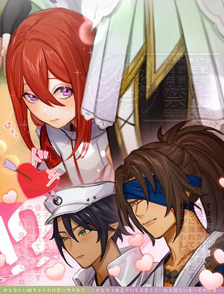 closed_mouth commentary_request dark-skinned_male dark_skin green_eyes hair_between_eyes high_ponytail ikaruga_(rune_factory) japanese_clothes kaori murasame_(rune_factory) ponytail purple_eyes red_hair rune_factory rune_factory:_guardians_of_azuma sayo_(rune_factory)