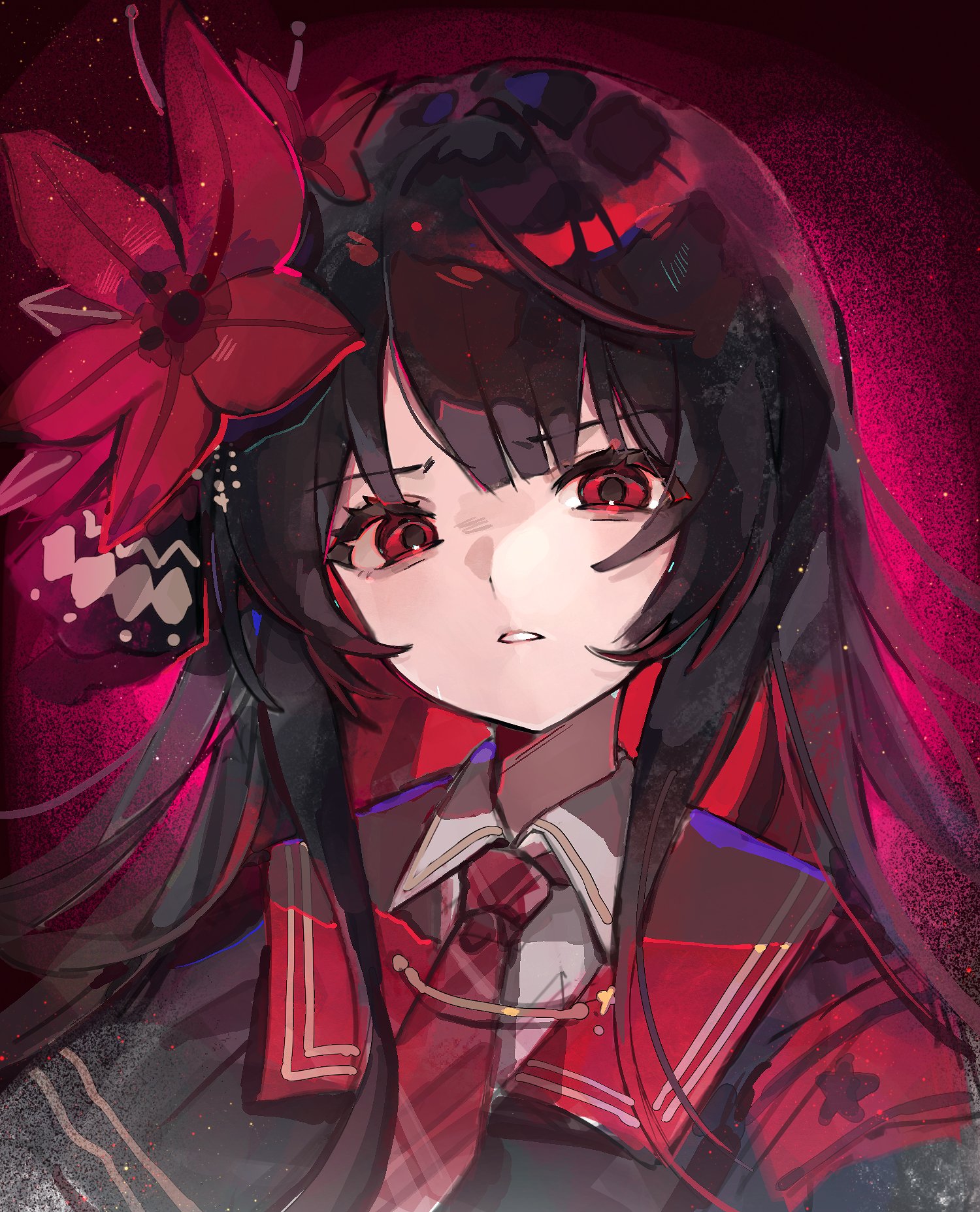 1girl armband black_hair black_jacket blunt_bangs collared_shirt commentary_request disgust flower hair_flower hair_ornament highres jacket long_hair looking_at_viewer mahou_shoujo_no_majo_saiban necktie nikaido_hiro parted_lips plaid_clothes plaid_necktie red_armband red_eyes red_flower red_necktie red_sailor_collar sailor_collar shirt solo upper_body white_shirt yinco