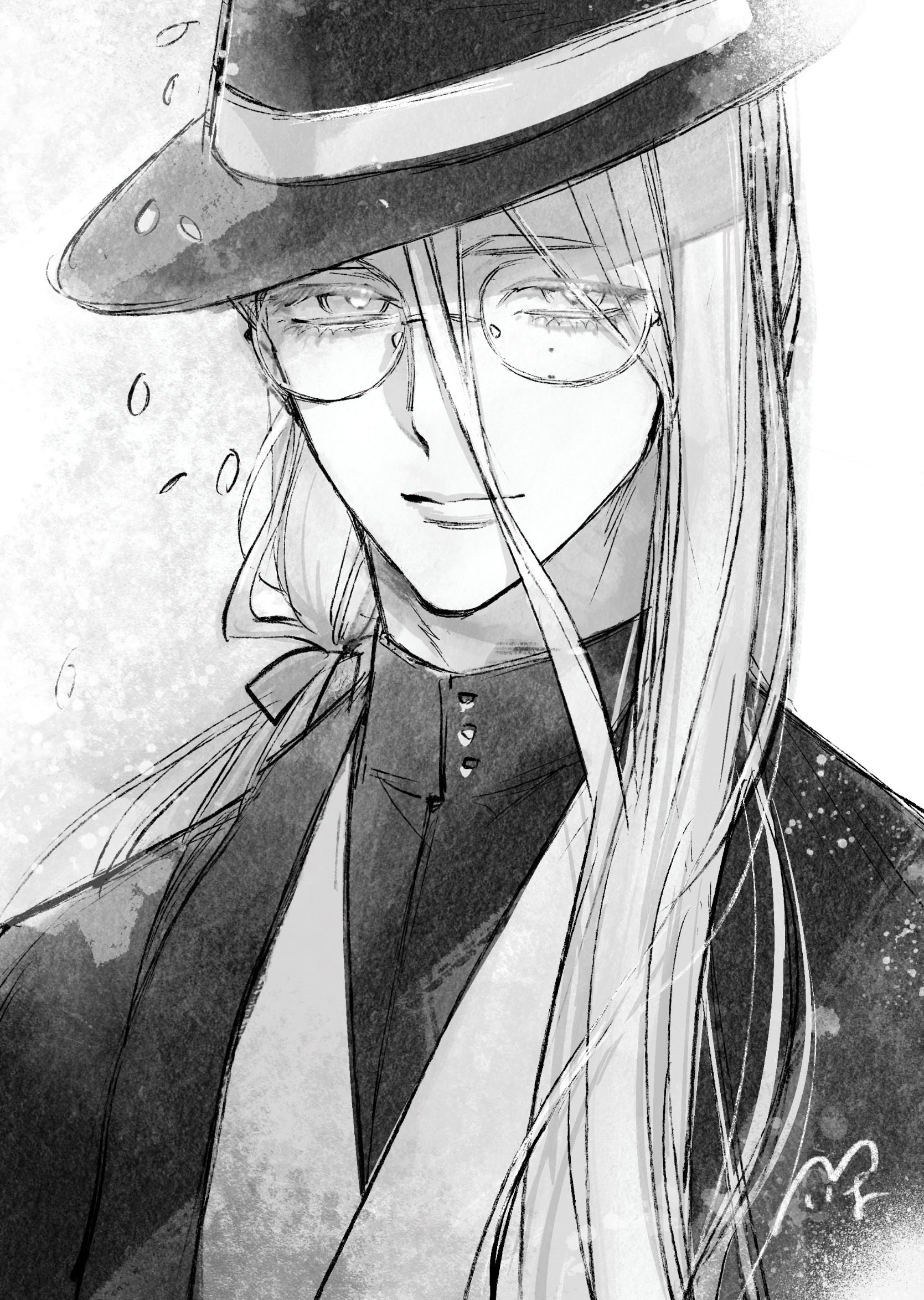 1boy commentary_request fate/grand_order fate_(series) fedora glasses greyscale hanasaka_no_okina_(fate) hat highres japanese_clothes kimono low_ponytail male_focus mole mole_under_eye monochrome multiple_moles ponytail shirt_under_kimono smile suzuki_tsuta upper_body