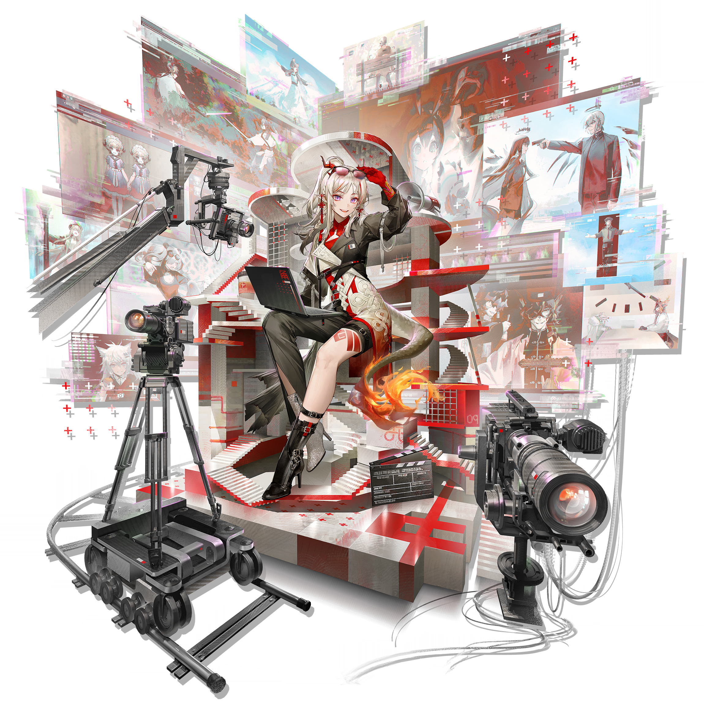 1girl aak_(arknights) amiya_(arknights) annie_(arknights) arknights arm_up bad_id bena_(arknights) black_boots black_jacket black_pants boots braid camera chongyue_(arknights) cj7 colored_skin computer doctor_(arknights) dragon_girl dragon_horns dragon_tail dress drunken_master earrings executor_(arknights) feater_(arknights) fire flame-tipped_tail forrest_gump full_body gloves high_heel_boots high_heels highres holding holding_tablet_pc honeyberry_(arknights) horns infernal_affairs jacket jesselton_williams_(arknights) jewelry lappland_(arknights) laptop lee_(arknights) leg_tattoo long_hair long_sleeves looking_at_viewer monitor muelsyse_(arknights) multicolored_hair multiple_girls nian_(arknights) nian_(thunderbolt_director)_(arknights) official_alternate_costume official_art open_clothes open_jacket pants pointy_ears purple_eyes qiubai_(arknights) rat_king_(arknights) red_hair screen singin'_in_the_rain sitting smile solo streaked_hair studio_montagne tablet_pc tail tattoo the_black_cannon_incident the_godfather the_shining the_sound_of_music the_truman_show tin_man_(arknights) transparent_background vampire_vs_vampire virtuosa_(arknights) wei_yenwu_(arknights) white_background white_hair