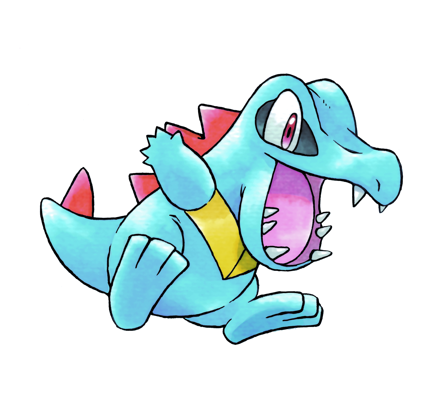 animal_focus fangs full_body gen_2_pokemon highres nintendo no_humans official_art open_mouth pokemon pokemon_(creature) pokemon_focus pokemon_gold/silver/crystal red_eyes second-party_source sharp_teeth simple_background solo spines sugimori_ken teeth totodile white_background