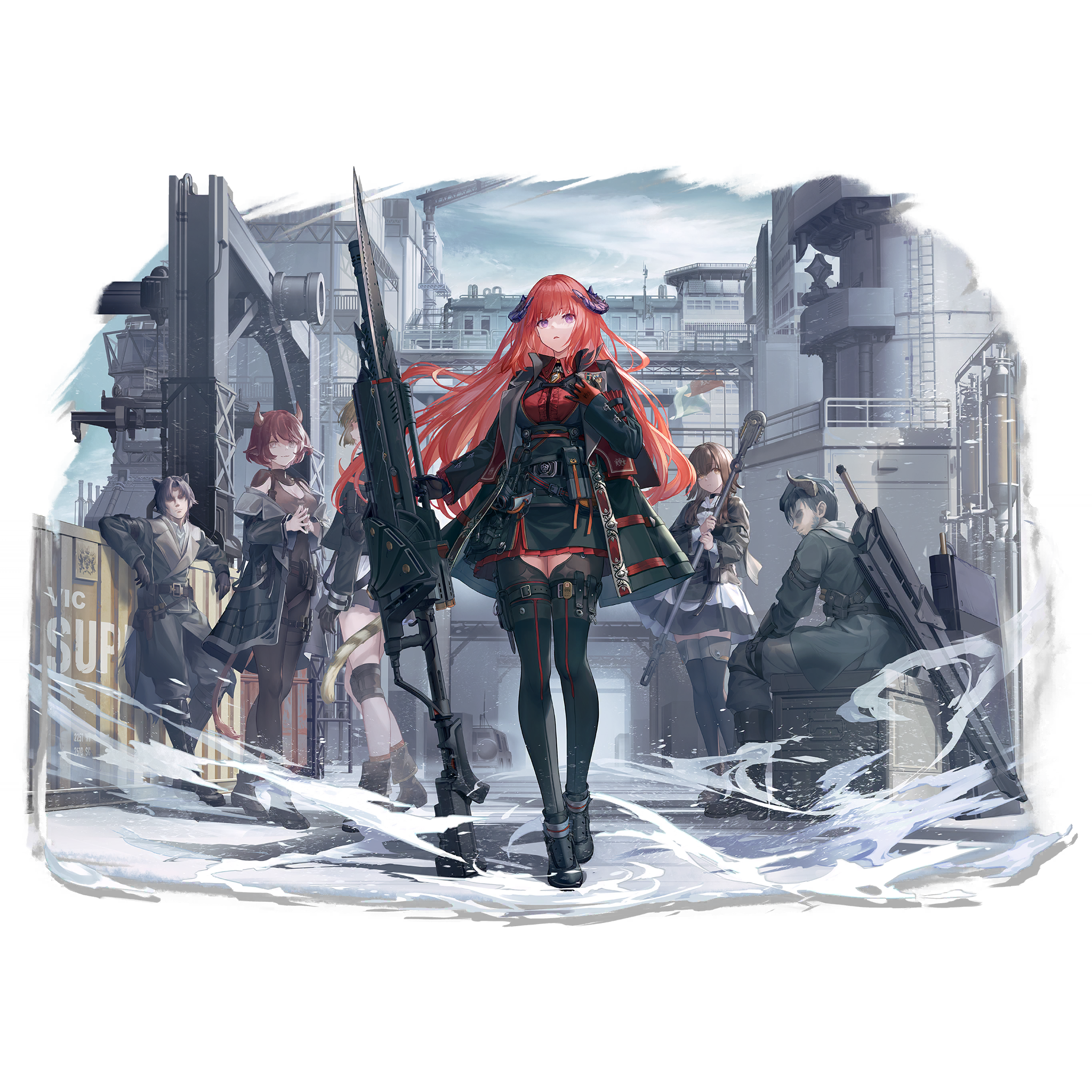 2boys 4girls animal_ears arknights bagpipe_(arknights) bagpipe_(royal_guardswoman)_(arknights) black_boots black_gloves black_hair black_jacket black_pants black_skirt black_thighhighs boots breasts brown_hair coat crate dragon_horns dress full_body gloves highres horns jacket lance long_hair long_sleeves looking_at_viewer medium_breasts multiple_boys multiple_girls off_shoulder official_alternate_costume official_art open_clothes open_jacket orange_hair outdoors pants polearm purple_eyes red_eyes red_hair red_shirt shirt short_hair sitting skirt sky smile spear standing suitcase sword thighhighs thighs transparent_background u-suke_(supertie) very_long_hair weapon weapon_on_back zettai_ryouiki