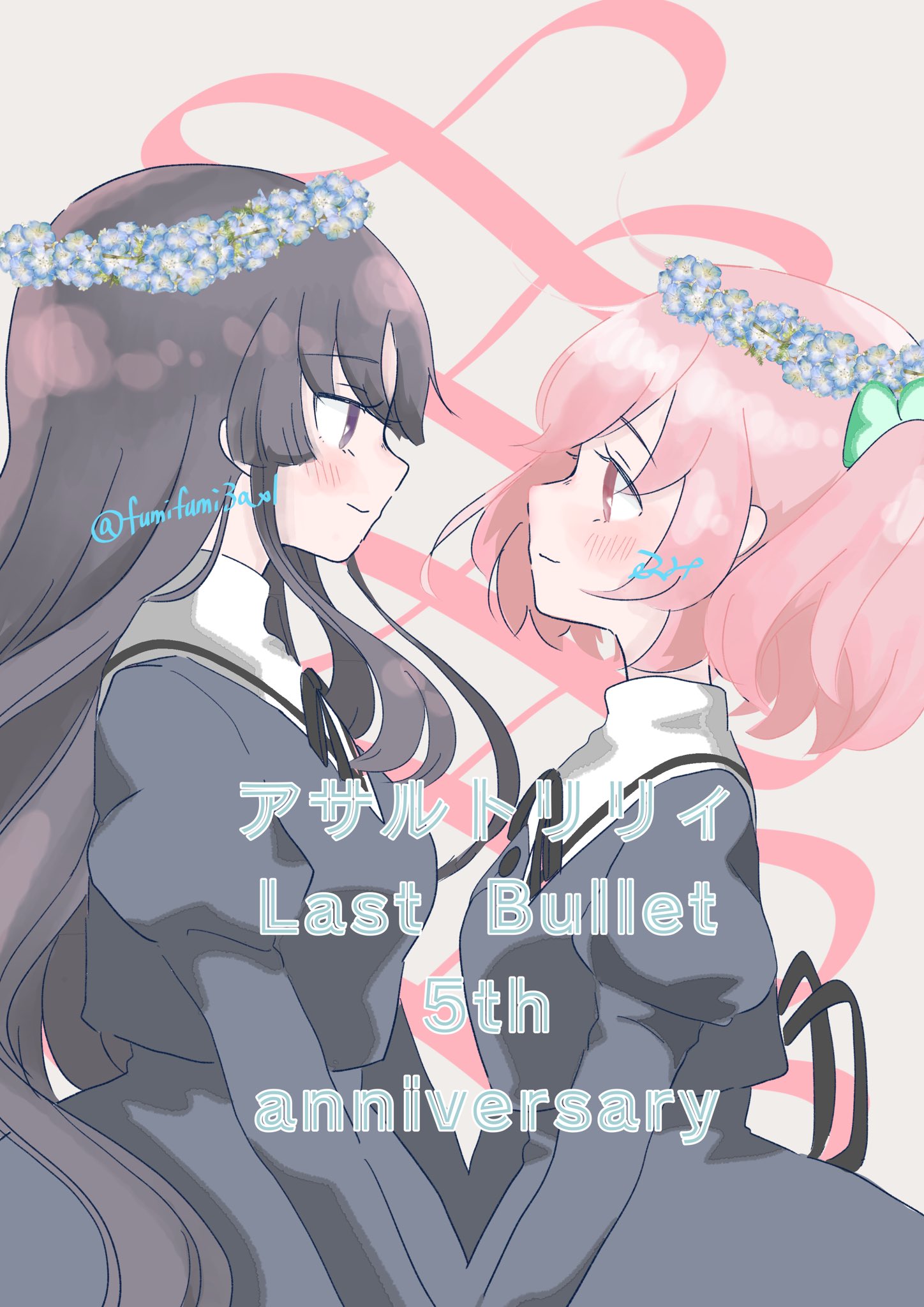 2girls anniversary artist_name assault_lily black_hair black_ribbon black_skirt blue_flower blush breasts closed_mouth clover_hair_ornament commentary copyright_name cropped_jacket eye_contact face-to-face flower flower_wreath from_side fumi_(fumifumi3axl) grey_background hair_ornament head_wreath high-waist_skirt highres hitotsuyanagi_riri juliet_sleeves long_hair long_sleeves looking_at_another medium_breasts multiple_girls neck_ribbon pink_eyes pink_hair pink_ribbon profile puffy_sleeves purple_eyes ribbon school_uniform shirai_yuyu short_hair simple_background skirt smile standing translated twitter_username upper_body very_long_hair yuri yurigaoka_girls_academy_school_uniform