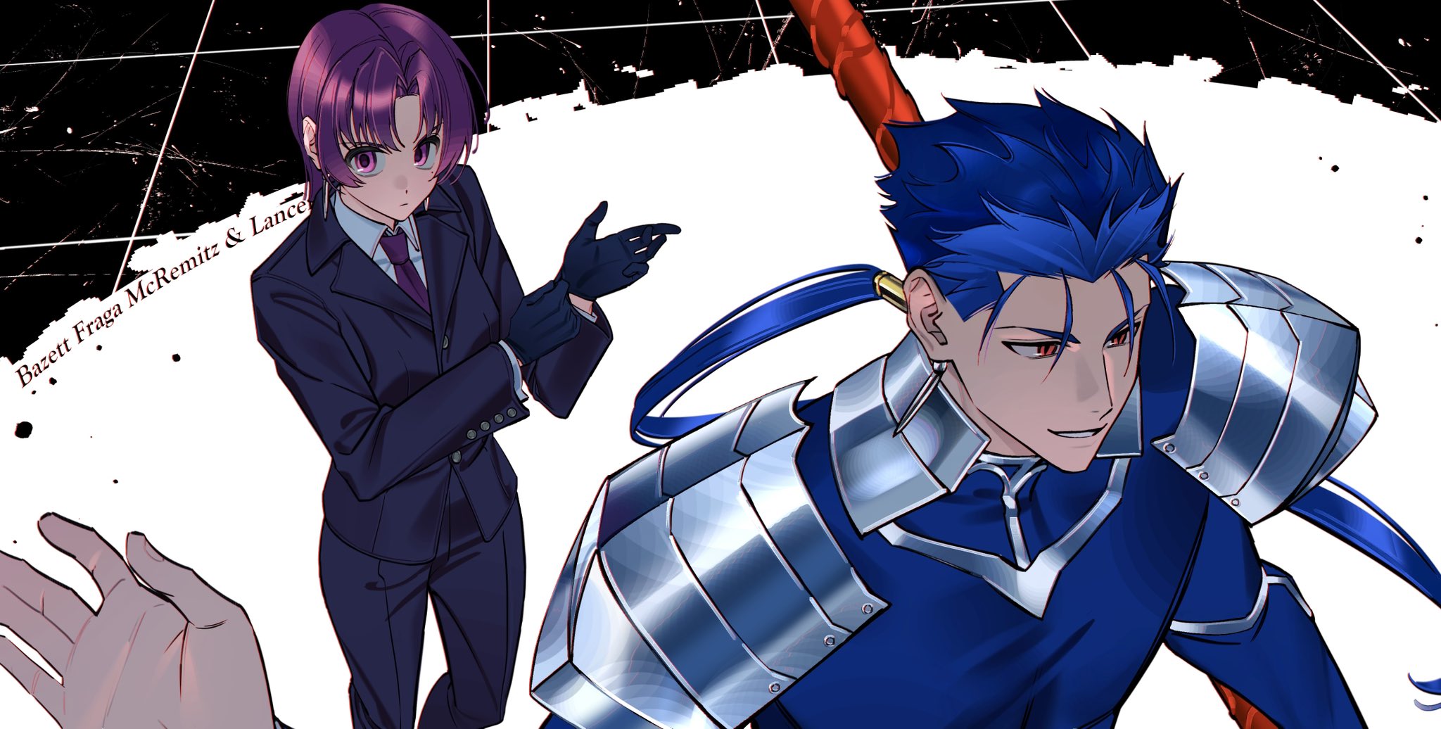 1boy 1girl adjusting_clothes adjusting_gloves arm_up armor black_pants black_suit blue_bodysuit blue_hair bodysuit character_name cowboy_shot cu_chulainn_(fate) cu_chulainn_(fate/stay_night) cu_chulainn_(lancer)_(fate) curtained_hair earrings english_text expressionless fate/hollow_ataraxia fate_(series) formal_clothes gae_bolg_(fate) gloves hair_tubes hashtag-only_commentary highres holding holding_polearm holding_weapon jewelry lapels long_hair long_sleeves looking_ahead looking_at_viewer medium_hair mole mole_under_eye necktie notched_lapels pants parted_lips pauldrons polearm ponytail purple_eyes purple_hair purple_necktie shoulder_armor slit_pupils smile suit upper_body weapon wing_collar y1n