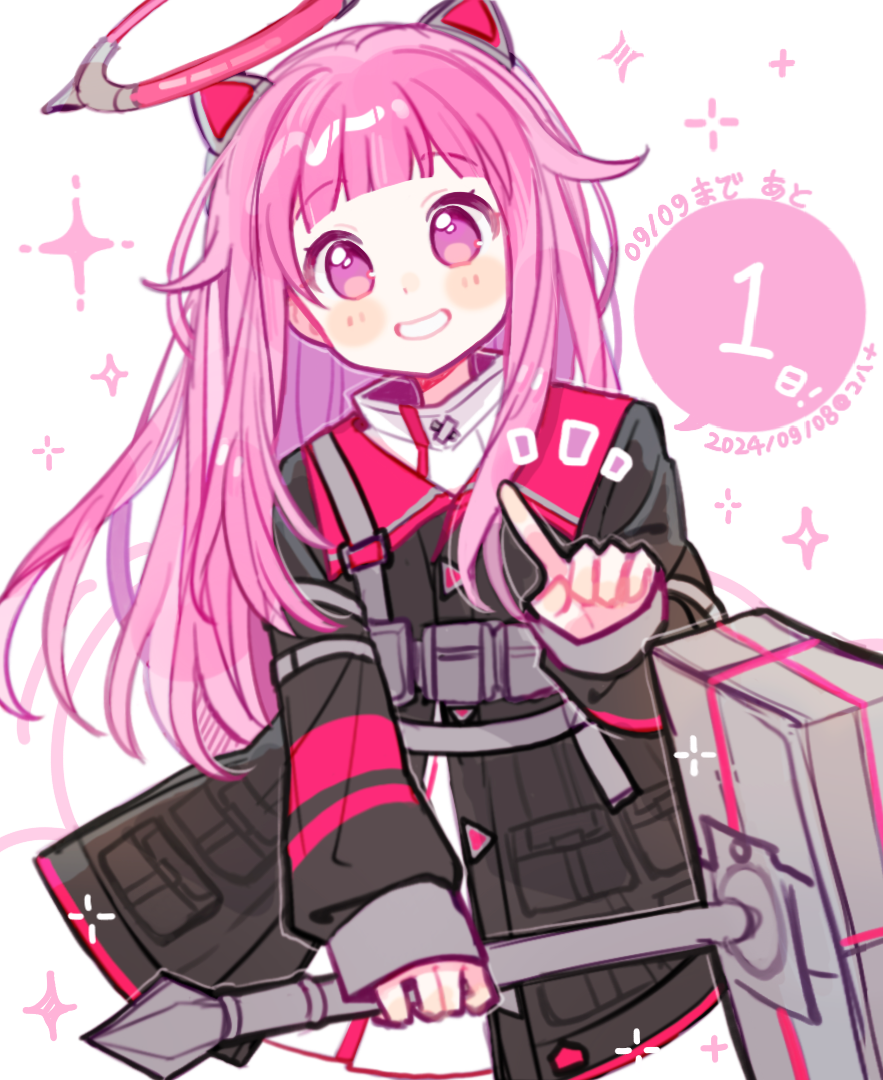1girl 2024 :d \||/ black_jacket blunt_bangs chinese_commentary cohana collared_jacket commentary_request cropped_torso dated dress flat_chest grin hair_behind_ear hair_flaps halo hammer hand_up holding holding_hammer holding_weapon index_finger_raised jacket long_hair long_sidelocks long_sleeves looking_at_viewer mechanical_halo no_pupils ootori_emu open_mouth partially_unbuttoned pink_eyes pink_hair pink_halo pleated_dress pocket project_sekai puffy_long_sleeves puffy_sleeves raised_eyebrows short_bangs short_dress sidelocks simple_background smile solo sparkle speech_bubble tareme translation_request turtleneck turtleneck_dress very_long_hair weapon white_background white_dress