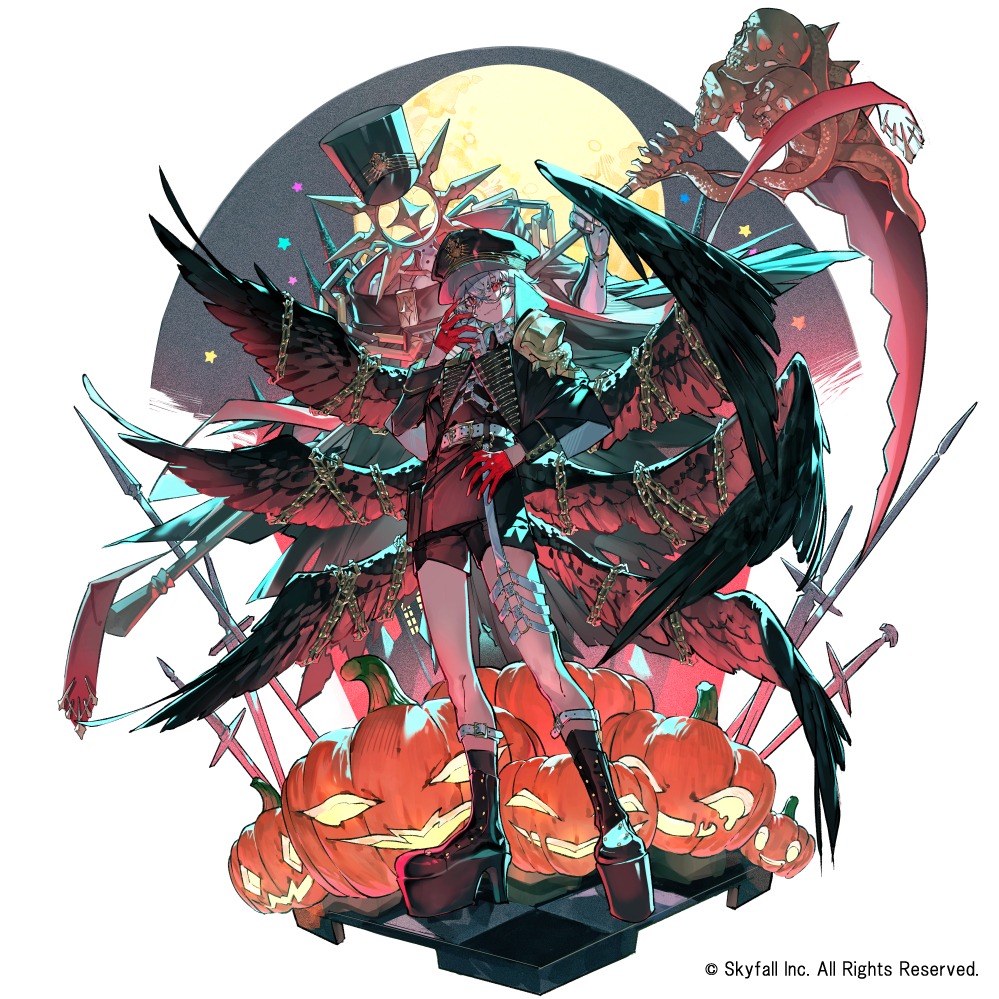 1girl boots chain commentary_request full_moon gloves hat holding holding_scythe jack-o'-lantern moon mura_karuki original platform_boots polearm pumpkin red_eyes red_gloves scythe skull spear sword weapon