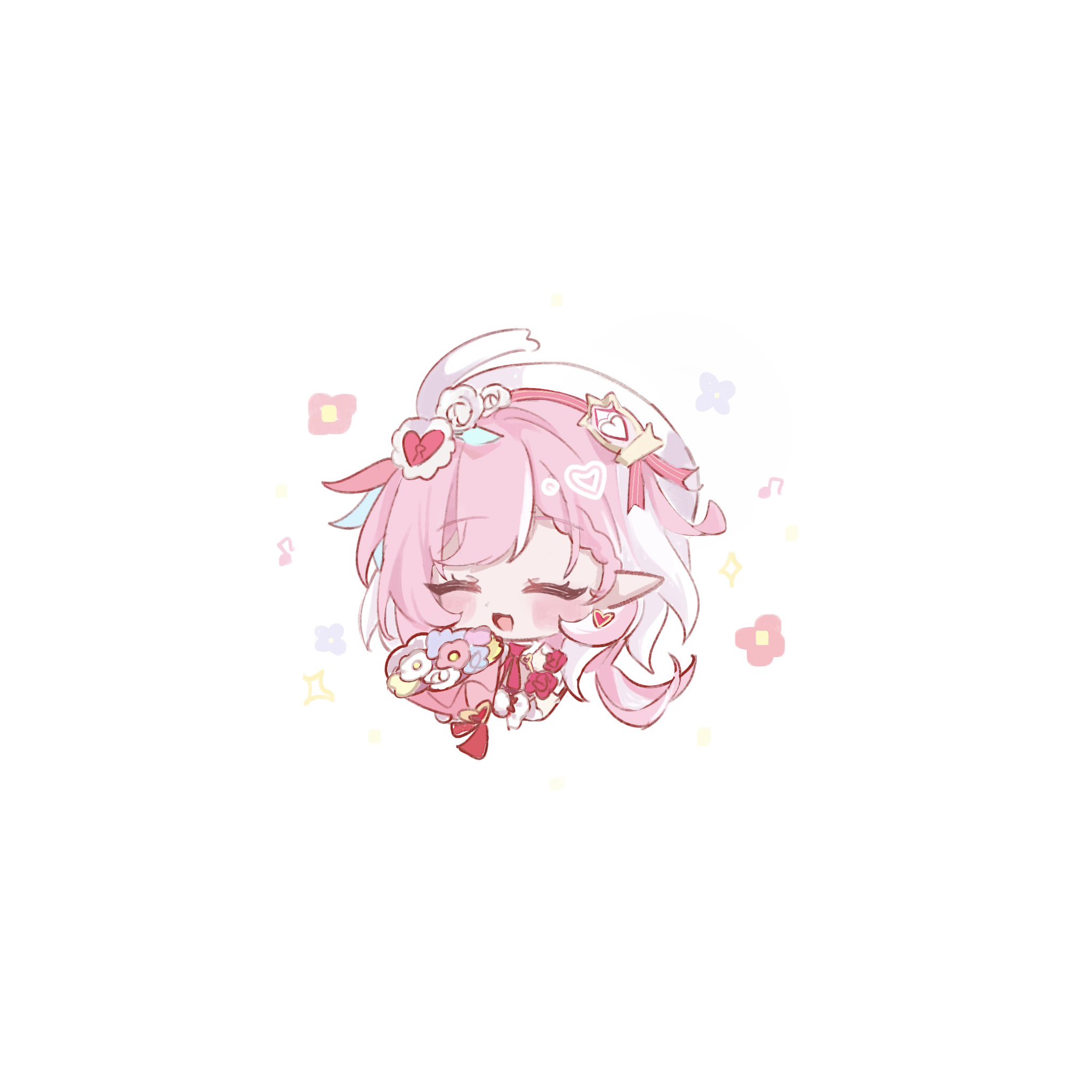1girl beret bouquet chibi chibi_only diamond_(shape) earrings elf elysia_(hi_love_elf)_(honkai_impact) elysia_(honkai_impact) flower hat heart heart_earrings highres holding holding_bouquet honkai_(series) honkai_impact_3rd jewelry long_hair multicolored_hair pink_hair pointy_ears simple_background smile solo symbol-shaped_pupils tdatnst two-tone_hair very_long_hair white_background white_hair