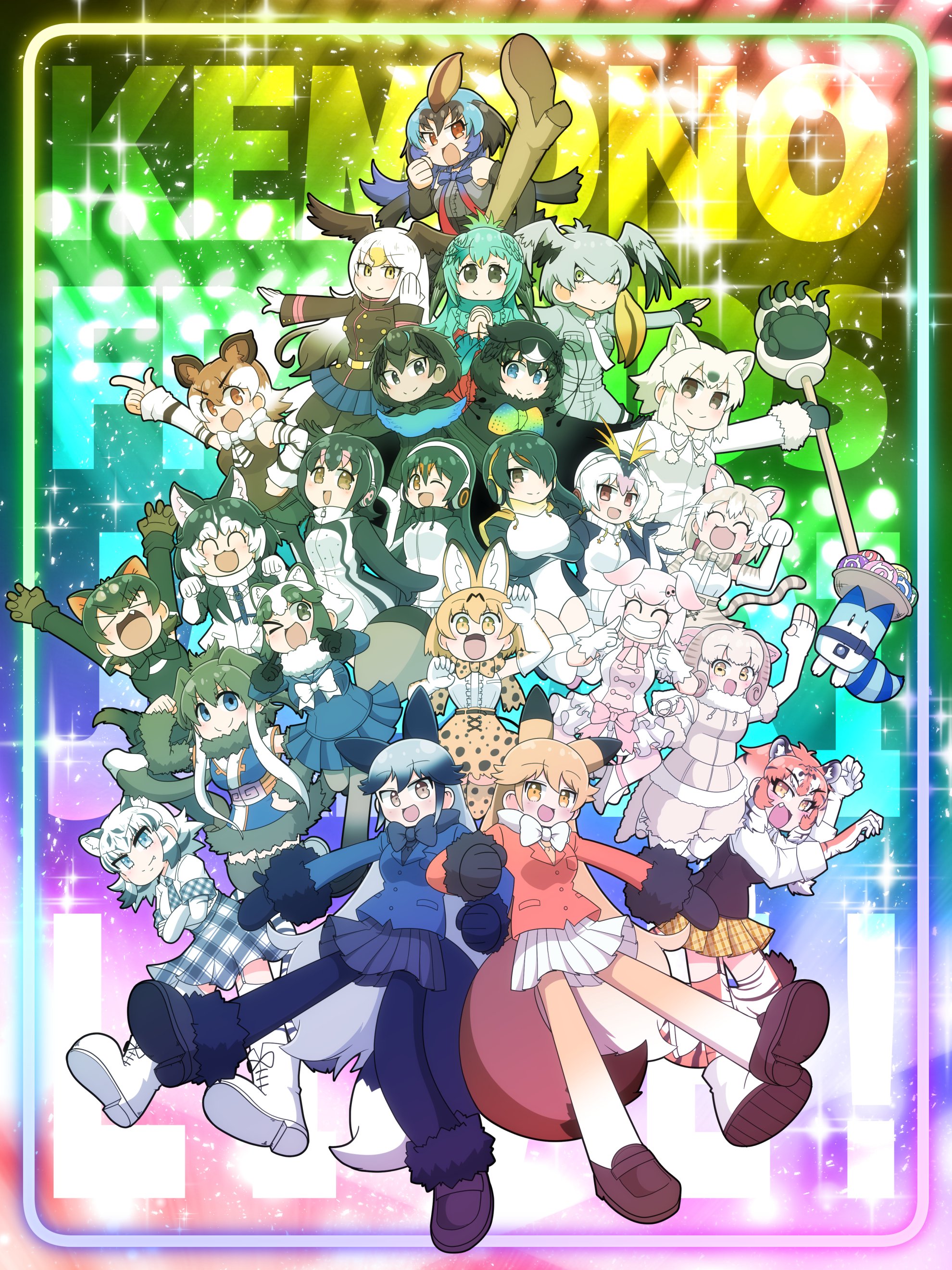 6+girls absurdres animal_ears bald_eagle_(kemono_friends) black_hair blonde_hair blue_hair brown_hair cat_(kemono_friends) emperor_penguin_(kemono_friends) extra_ears ezo_red_fox_(kemono_friends) feathered_wings food gentoo_penguin_(kemono_friends) green_hair grey_hair hachikuji_kenuta head_wings highres humboldt_penguin_(kemono_friends) japari_bun kemono_friends long_hair looking_at_viewer lucky_beast_(kemono_friends) mammoth_(kemono_friends) multiple_girls okapi_(kemono_friends) orange_hair pig_(kemono_friends) pink_hair polar_bear_(kemono_friends) resplendent_quetzal_(kemono_friends) royal_penguin_(kemono_friends) serval_(kemono_friends) sheep_(kemono_friends) shoebill_(kemono_friends) short_hair siberian_husky_(kemono_friends) siberian_tiger_(kemono_friends) silver_fox_(kemono_friends) southern_cassowary_(kemono_friends) superb_bird-of-paradise_(kemono_friends) tail tanuki_(kemono_friends) tasmanian_devil_(kemono_friends) western_parotia_(kemono_friends) white_hair white_tiger_(kemono_friends) wings