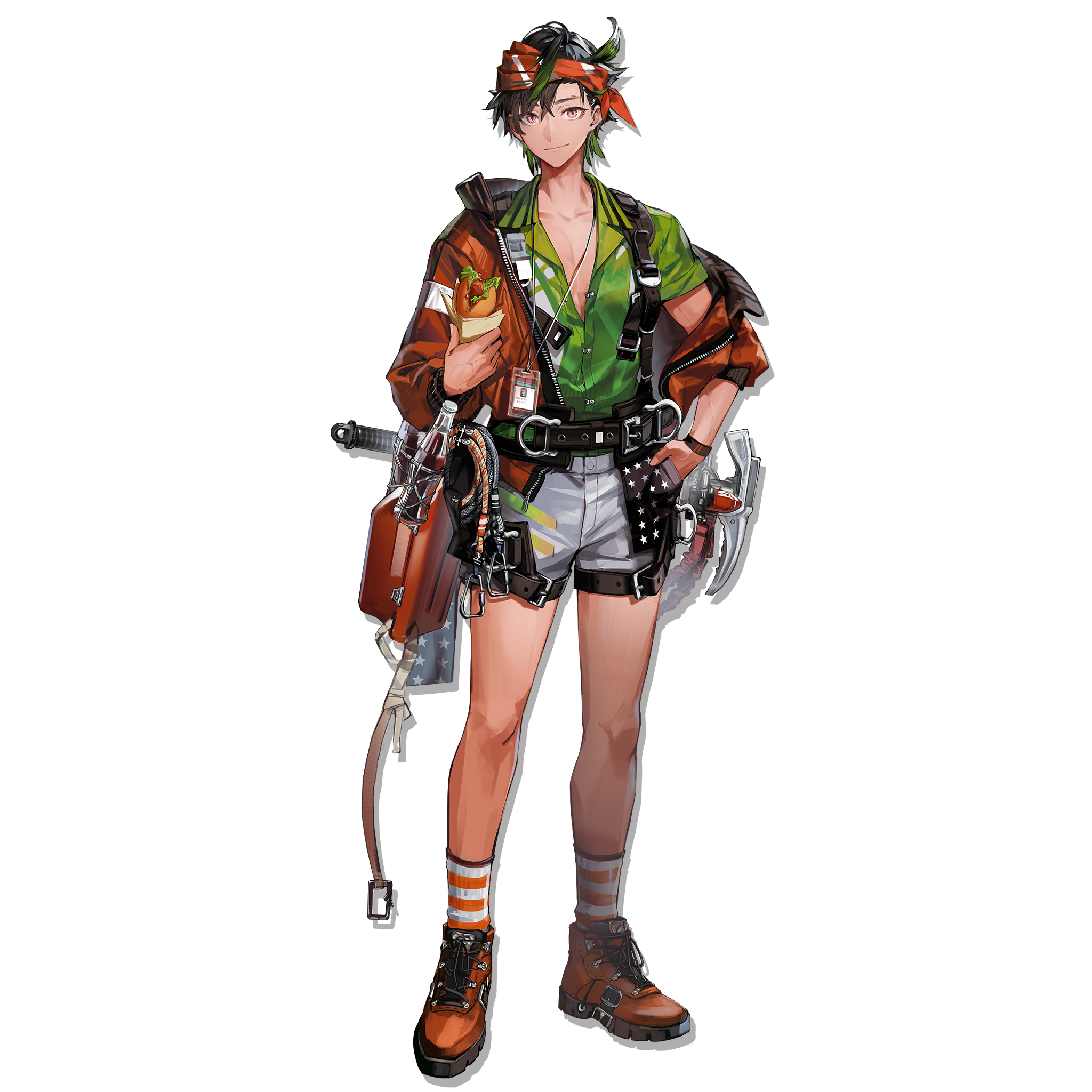 1boy ahoge ankle_socks arknights belt bishounen black_hair boots brown_jacket bryophyta_(arknights) cenm0 drop_shadow dyed_ahoge food full_body green_hair green_shirt headband highres holding holding_food hot_dog ice_axe id_card jacket looking_at_viewer male_focus official_art orange_headband partially_unbuttoned pectoral_cleavage pectorals pink_eyes rope shirt short_hair shorts smile socks solo striped_clothes striped_socks tachi-e third-party_source transparent_background white_shorts