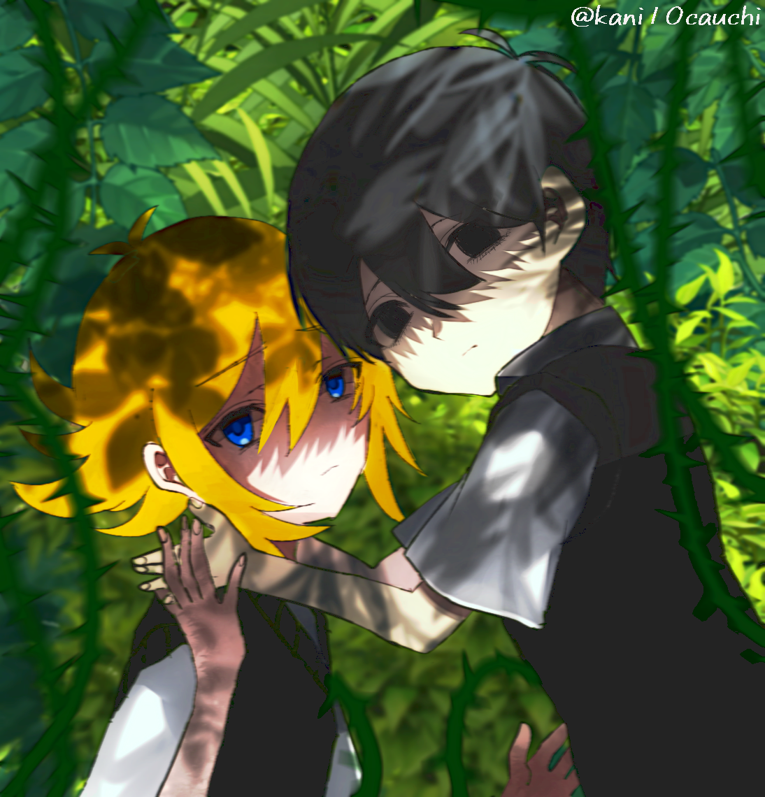2boys alternate_color antenna_hair basil_(faraway)_(omori) basil_(omori) black_eyes black_hair black_sweater_vest blonde_hair blue_eyes closed_mouth collared_shirt commentary_request double-parted_bangs hair_between_eyes kauchi_(kani10cauchi) looking_at_viewer male_focus multiple_boys omori plant shirt short_hair sidelocks sunny_(omori) sweater_vest thorns twitter_username vines white_shirt