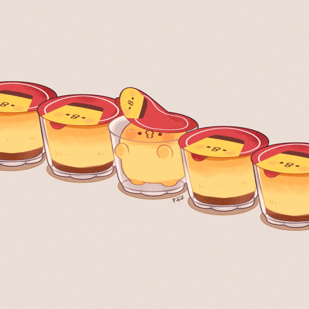 baby_animal bird chick chicken commentary_request food grey_background kimipiyo_(tenmiyakiyo) no_humans original pudding simple_background tenmiyakiyo