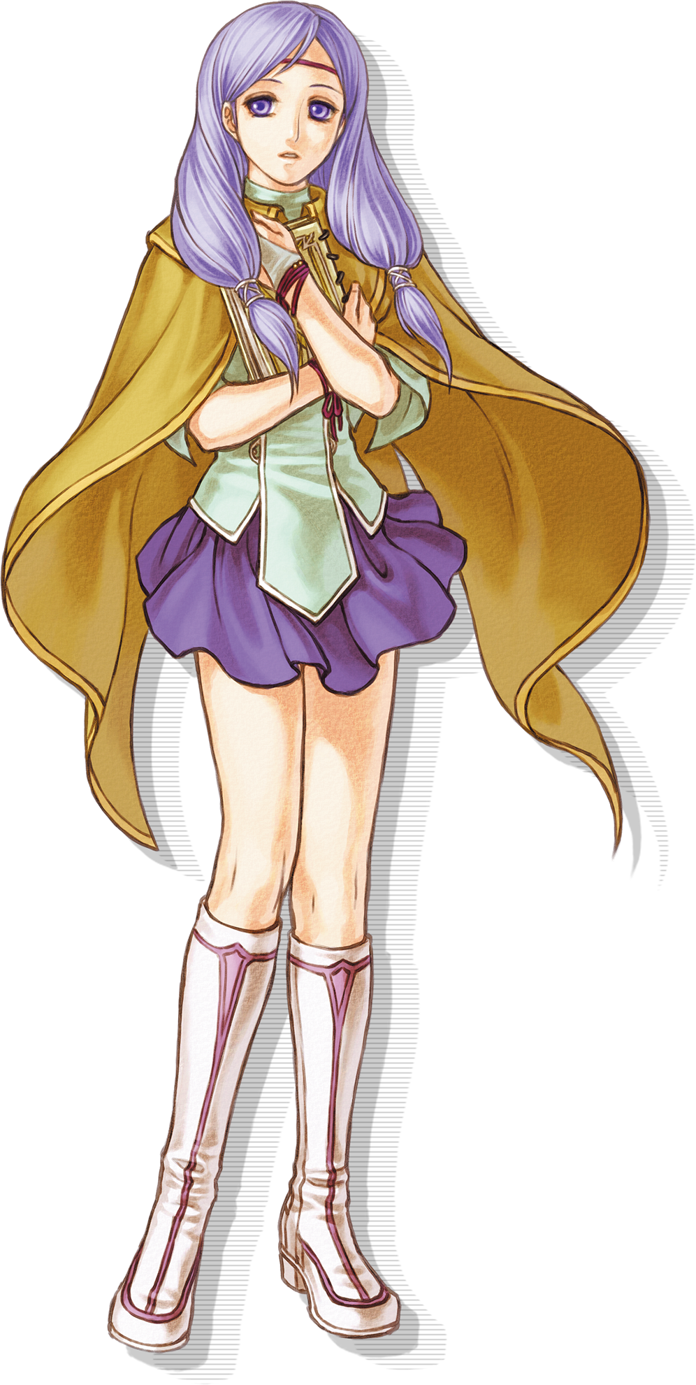 1girl book boots circlet fire_emblem fire_emblem:_radiant_dawn green_tunic highres holding holding_book ilyana_(fire_emblem) kita_senri multicolored_boots nintendo official_art purple_eyes purple_hair purple_skirt skirt third-party_source tunic turtleneck_tunic two-tone_boots white_boots yellow_cloak