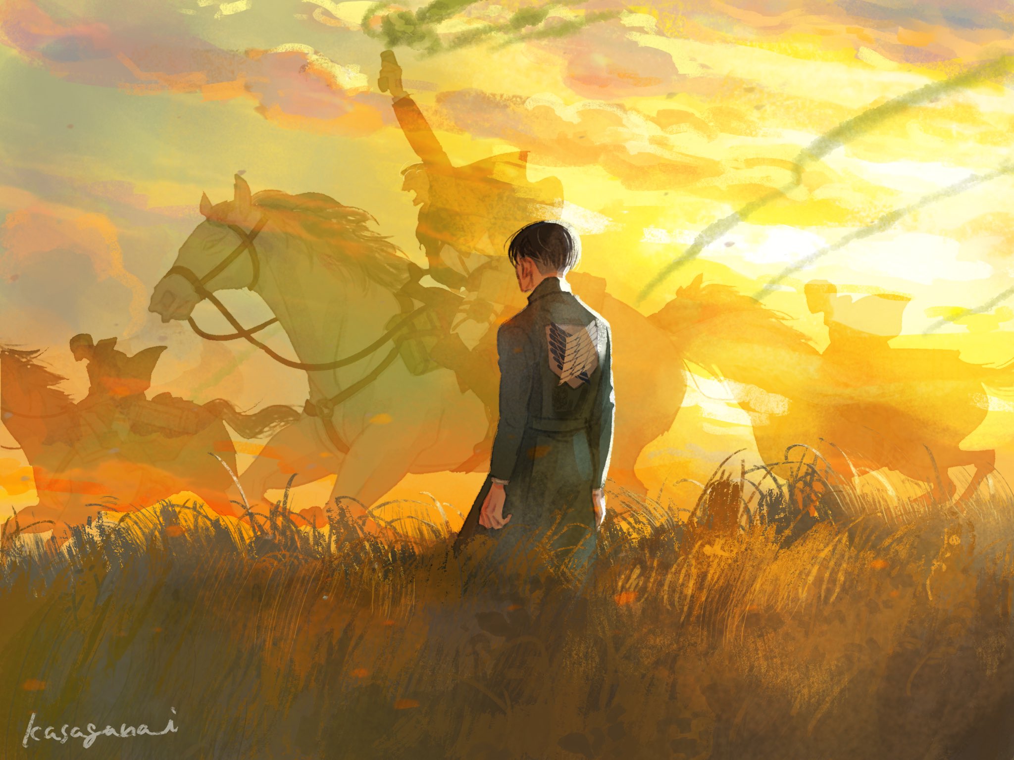 4boys artist_name black_hair commentary_request cow erwin_smith facing_away field from_behind ghost highres horseback_riding jacket kasagana_i levi_(shingeki_no_kyojin) male_focus military_jacket multiple_boys open_mouth outdoors riding shingeki_no_kyojin short_hair sunset survey_corps_(emblem)