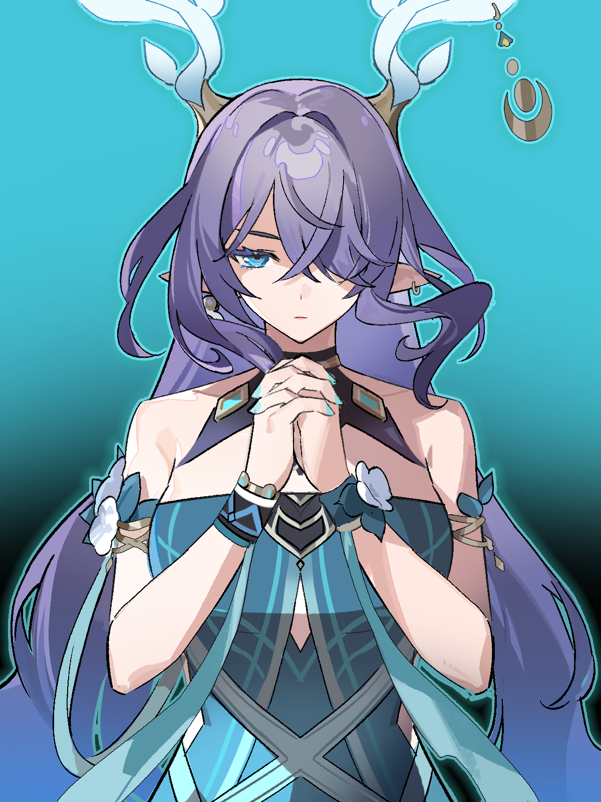 1girl antlers aqua_nails bare_shoulders blue_dress blue_eyes chinese_commentary closed_mouth commentary_request dress earrings genshin_impact green_background hair_ornament hair_over_one_eye highres horns jewelry lauma_(genshin_impact) long_hair looking_at_viewer official_alternate_costume own_hands_clasped own_hands_together pointy_ears purple_hair shuimusang_lingganguban solo upper_body