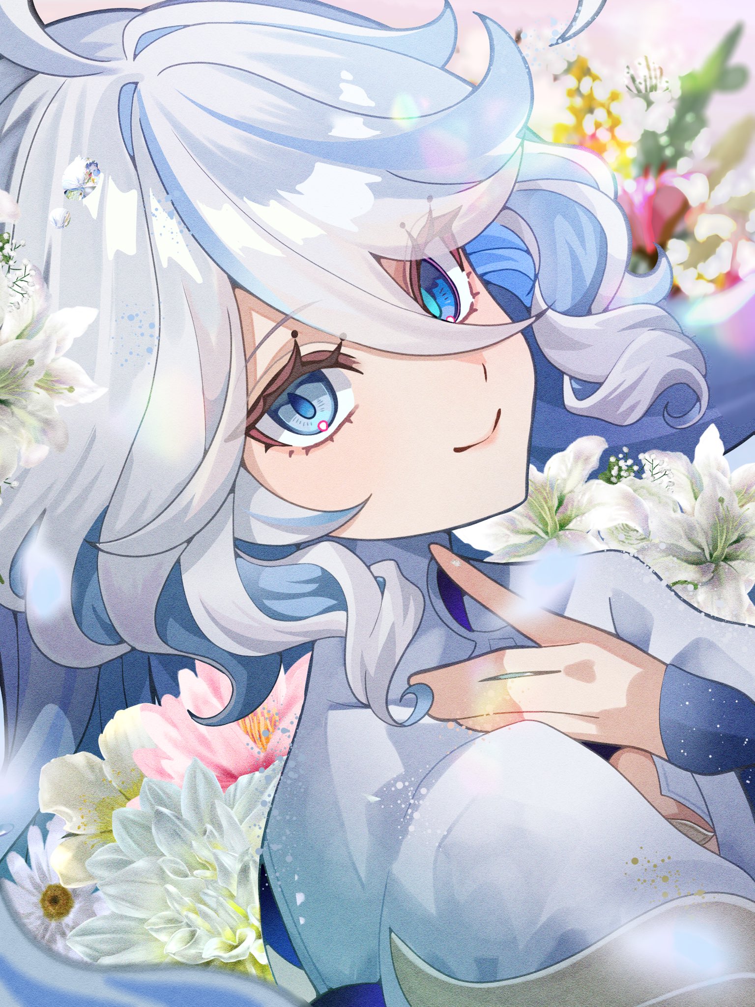 1girl blue_eyes blue_hair blue_pupils closed_mouth commentary dress drop-shaped_pupils flower focalors_(genshin_impact) genshin_impact hair_between_eyes hand_up heterochromia highres long_hair long_sleeves looking_at_viewer mismatched_pupils multicolored_hair rei_(sss35_ss3) smile solo symbol-shaped_pupils upper_body wavy_hair white_hair