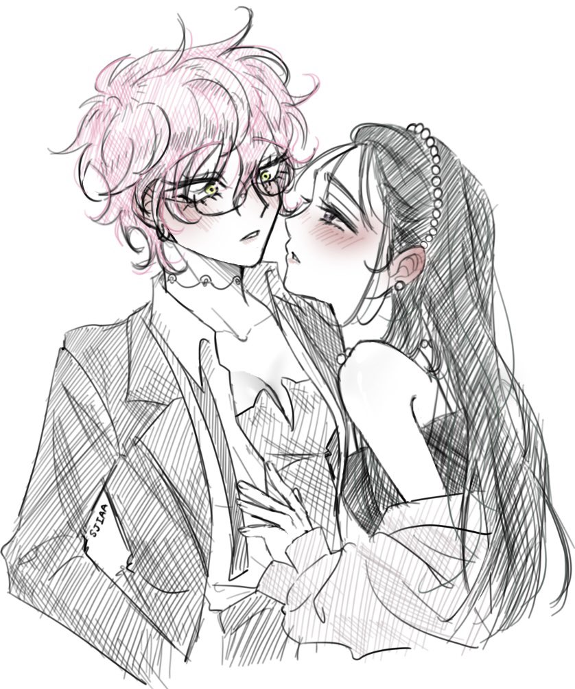 2girls alien_stage black_hair collared_shirt commentary dress earrings english_commentary glasses jacket jewelry long_hair mizi_(alien_stage) multiple_girls off_shoulder official_alternate_costume official_alternate_hair_length official_alternate_hairstyle pearl_earrings pearl_hairband pink_hair purple_eyes shirt short_hair signature sjiaa sleeveless sleeveless_dress sphere_earrings sua_(alien_stage) suit_jacket very_short_hair yellow_eyes yuri