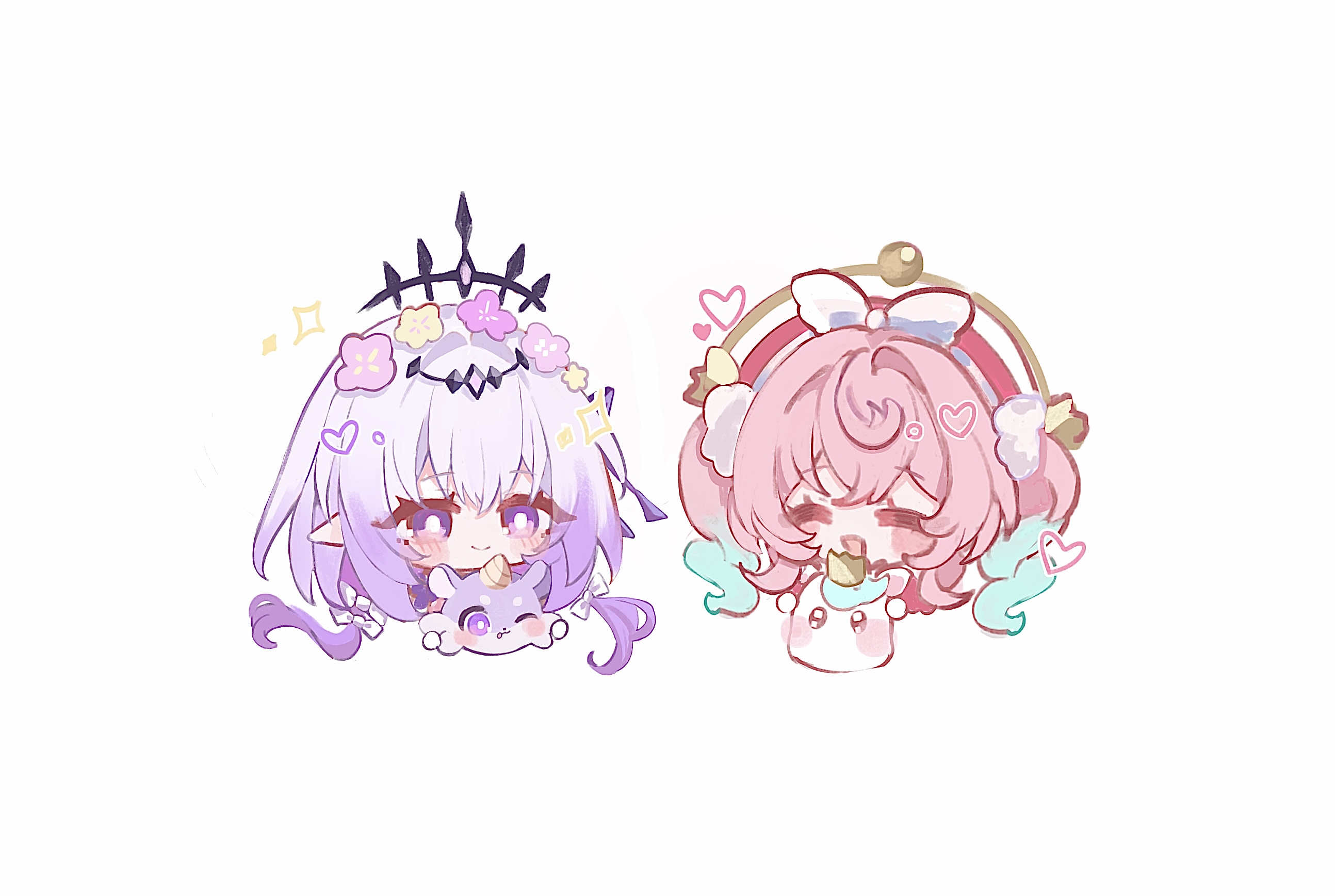 2girls ^_^ blush bow bright_pupils castorice_(butterfly_cake)_(honkai:_star_rail) castorice_(honkai:_star_rail) chibi chimera_(honkai:_star_rail) closed_eyes commentary drill_hair gradient_hair hat heart highres honkai:_star_rail honkai_(series) hyacine_(honkai:_star_rail) little_ica_(honkai:_star_rail) long_hair multicolored_hair multiple_girls pink_hair pointy_ears purple_eyes ribbon sparkle untranslatable_commentary tdatnst tiara twin_drills white_background