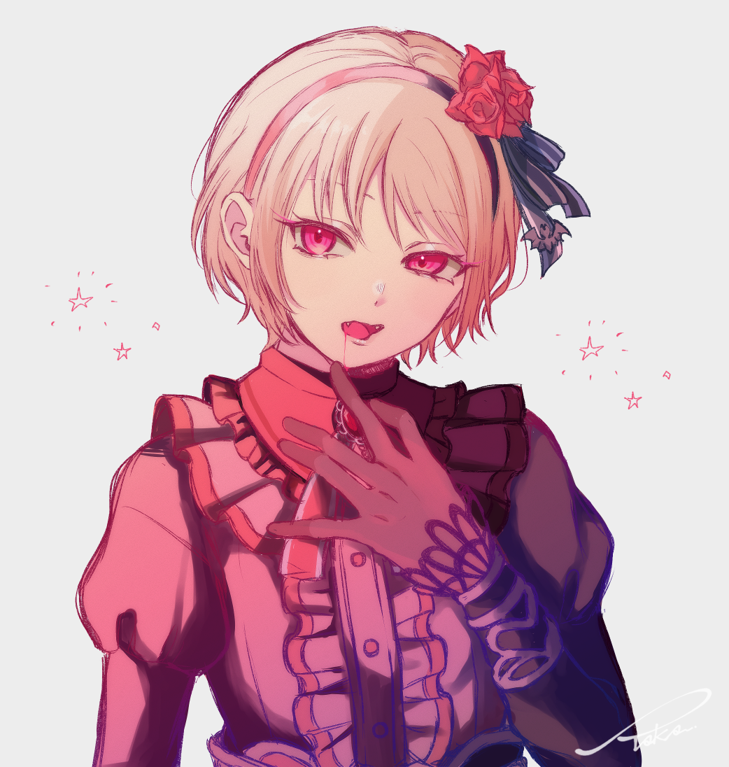 1other akiyama_mizuki akiyama_mizuki_(middle_school) androgynous bat_ornament black_gloves brooch center_frills commentary fake_blood fangs flower flower_hairband frills gem gloves grey_background hairband hand_up jewelry juliet_sleeves kono_hito_hari_ni_omoi_wo_komeru_(project_sekai) long_sleeves looking_at_viewer official_alternate_costume official_alternate_hair_length official_alternate_hairstyle open_mouth other_focus parted_lips pink_eyes pink_hair pink_shirt project_sekai puffy_sleeves purple_shirt red_flower red_gem red_rose rose shirt short_hair signature solo star_(symbol) t_b7ce390