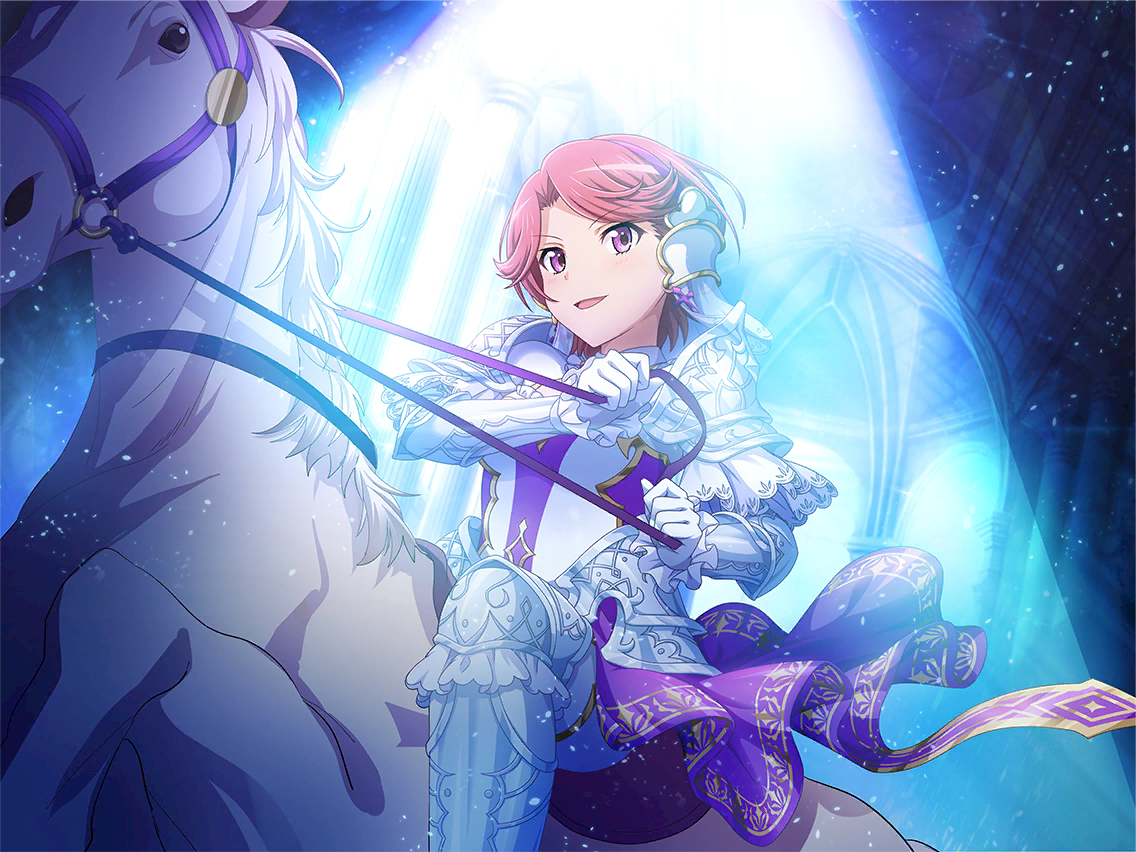 1girl armor arthurian_legend cosplay dress galahad_(mythology) galahad_(mythology)_(cosplay) game_cg gloves horse horseback_riding isurugi_futaba looking_at_viewer official_art parted_bangs parted_lips pink_hair purple_eyes riding short_hair shoujo_kageki_revue_starlight shoujo_kageki_revue_starlight_-re_live- shoulder_armor solo spotlight white_dress white_gloves