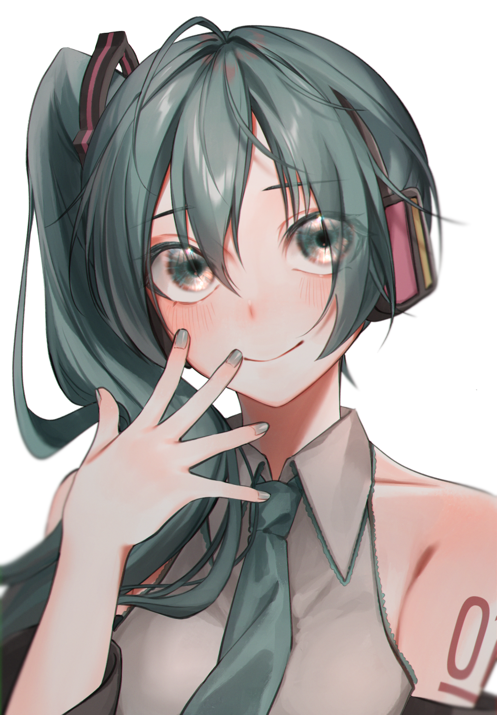 1girl alternate_hairstyle closed_mouth collared_shirt commentary_request detached_sleeves green_hair green_nails green_necktie grey_shirt hair_between_eyes hatsune_miku hatsune_miku_(noodle_stopper) headphones highres long_hair looking_at_viewer meme necktie shirt shoulder_tattoo side_ponytail sidetail_miku_noodle_stopper_(meme) simple_background sleeveless sleeveless_shirt solo tattoo upper_body violet_(mesy4285) vocaloid white_background