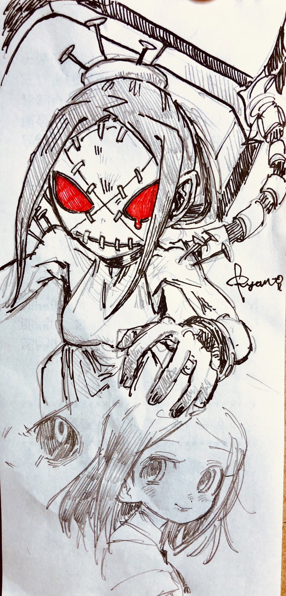 1girl black_sclera blush carol_(skullgirls) colored_sclera cuffs cyborg graphite_(medium) long_hair mask painwheel_(skullgirls) pen_(medium) portrait red_eyes ryantoruhuhu shackles skullgirls smile solo teardrop traditional_media veins